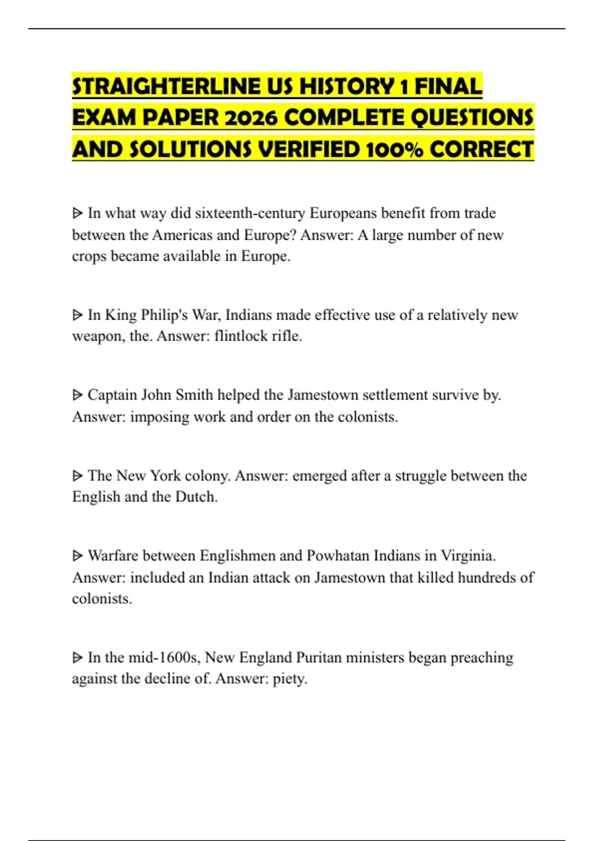 STRAIGHTERLINE US HISTORY 1 FINAL EXAM PAPER 2026 COMPLETE QUESTIONS AND SOLUTIONS VERIFIED 100% CORRECT