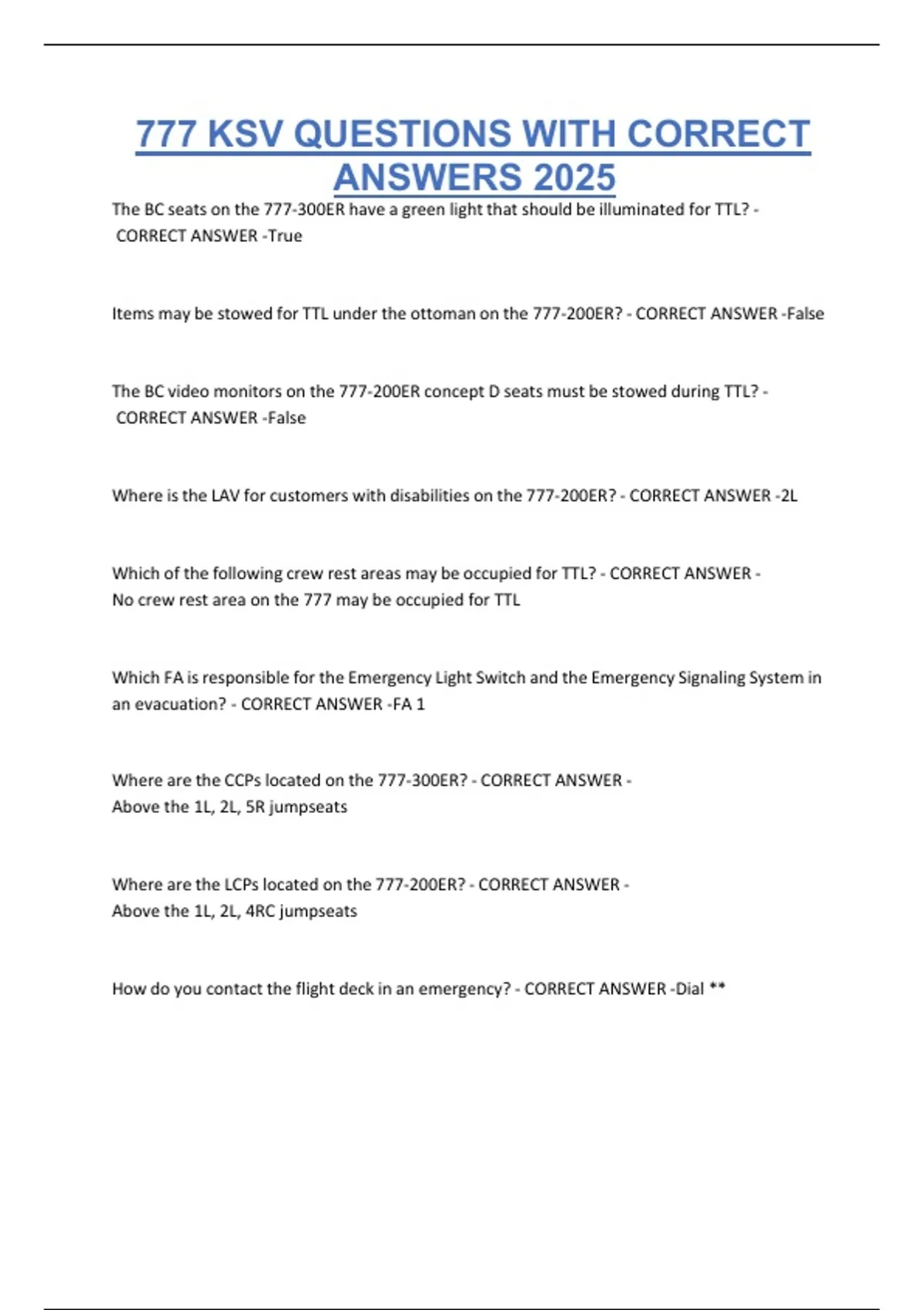 Items may be stowed for TTL under the ottoman on the 777-200ER? - CORRECT ANSWER -False