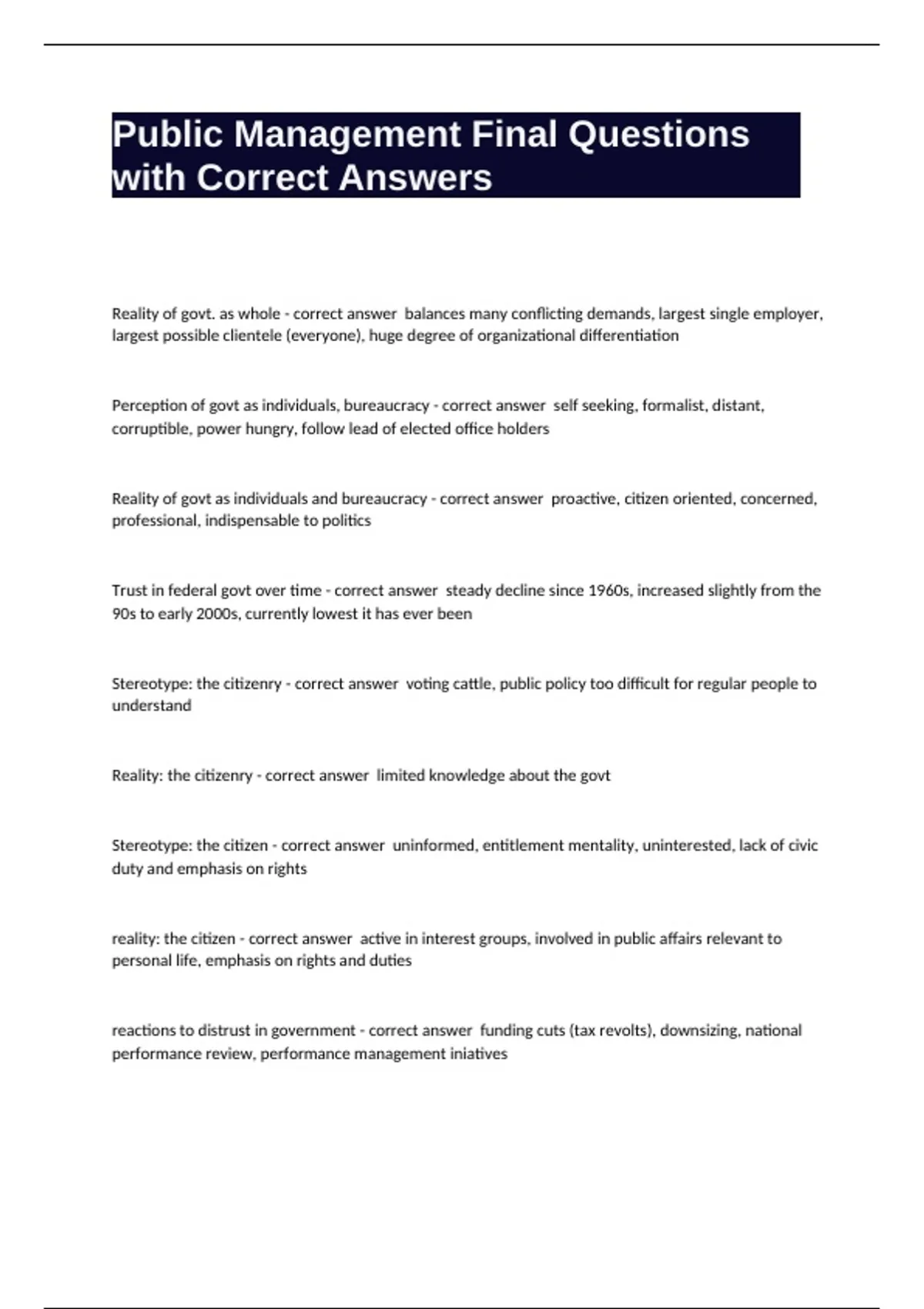 Public Management Final Questions with Correct Answers
