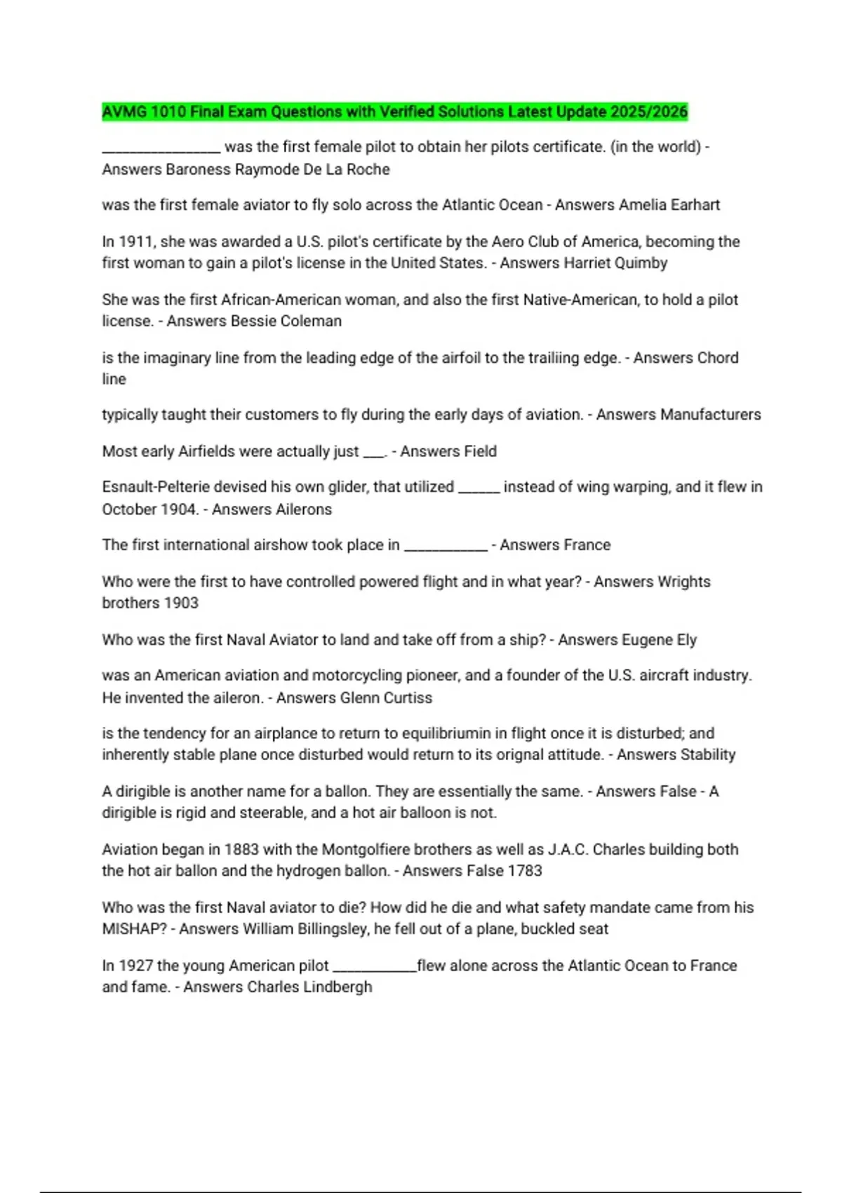 AVMG 1010 Final Exam Questions with Verified Solutions Latest Update 2025/2026 _________________ was the first female pilot to obtain her pilots certificate. (in the world) - Answers Baroness Raymode De La Roche was the first female aviator to fly solo across the Atlantic Ocean - Answers Amelia Earhart In 1911, she was awarded a U.S. pilot's certificate by the Aero Club of America, becoming the first woman to gain a pilot's license in the United States. - Answers Harriet Quimby She was the first African-American woman, and also the first Native-American, to hold a pilot license. - Answers Bessie Coleman is the imaginary line from the leading edge of the airfoil to the trailiing edge. - Answers Chord line typically taught their customers to fly during the early days of aviation. - Answers Manufacturers Most early Airfields were actually just ___. - Answers Field Esnault-Pelterie devised his own glider, that utilized ______ instead of wing warping, and it flew in October 1904. - Answers Ailerons The first international airshow took place in ____________ - Answers France Who were the first to have controlled powered flight and in what year? - Answers Wrights brothers 1903 Who was the first Naval Aviator to land and take off from a ship? - Answers Eugene Ely was an American aviation and motorcycling pioneer, and a founder of the U.S. aircraft industry. He invented the aileron. - Answers Glenn Curtiss is the tendency for an airplance to return to equilibriumin in flight once it is disturbed; and inherently stable plane once disturbed would return to its orignal attitude. - Answers Stability A dirigible is another name for a ballon. They are essentially the same. - Answers False - A dirigible is rigid and steerable, and a hot air balloon is not. Aviation began in 1883 with the Montgolfiere brothers as well as J.A.C. Charles building both the hot air ballon and the hydrogen ballon. - Answers False 1783 Who was the first Naval aviator to die? How did he die and what safety mandate came from his MISHAP? - Answers William Billingsley, he fell out of a plane, buckled seat In 1927 the young American pilot ____________flew alone across the Atlantic Ocean to France and fame. - Answers Charles Lindbergh