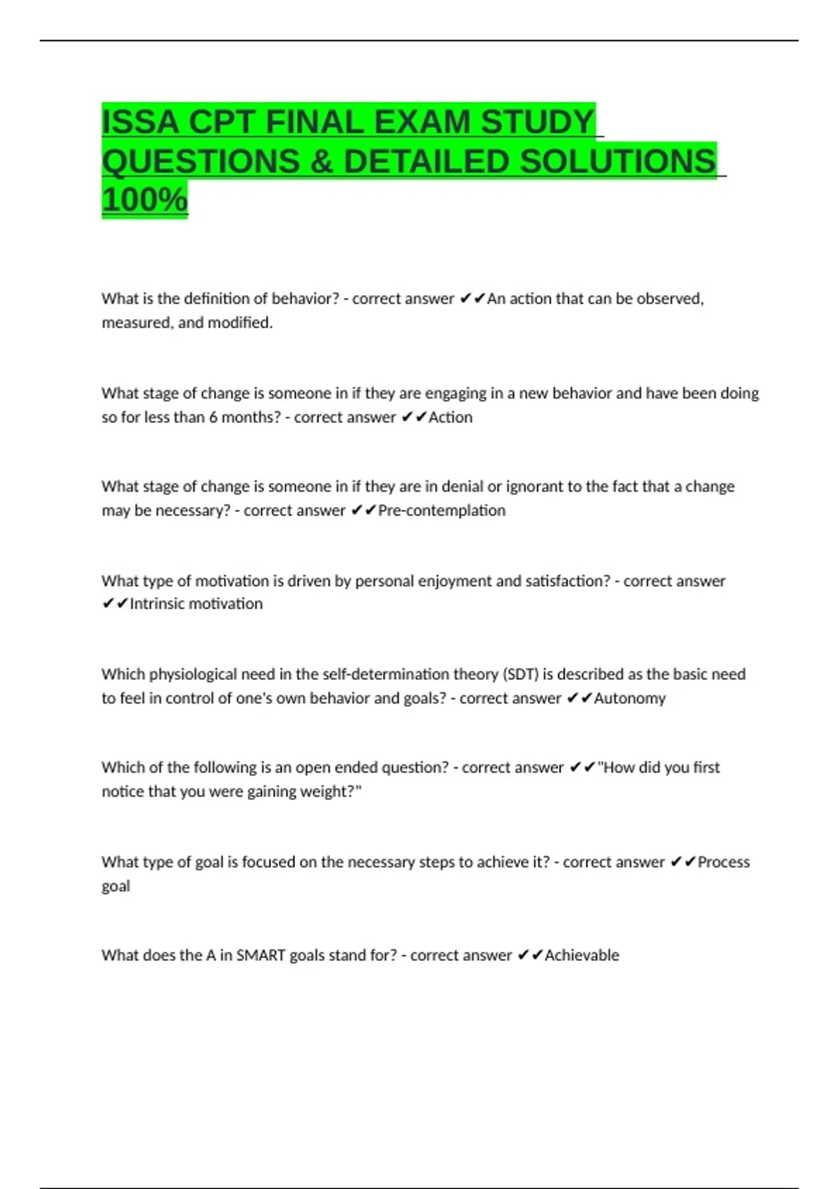 ISSA CPT FINAL EXAM STUDY QUESTIONS & DETAILED SOLUTIONS 100% flagship program offered by the International Sports Sciences Association. It’s designed to prepare learners to become professional fitness trainers with a strong foundation in exercise science, coaching, and program design.