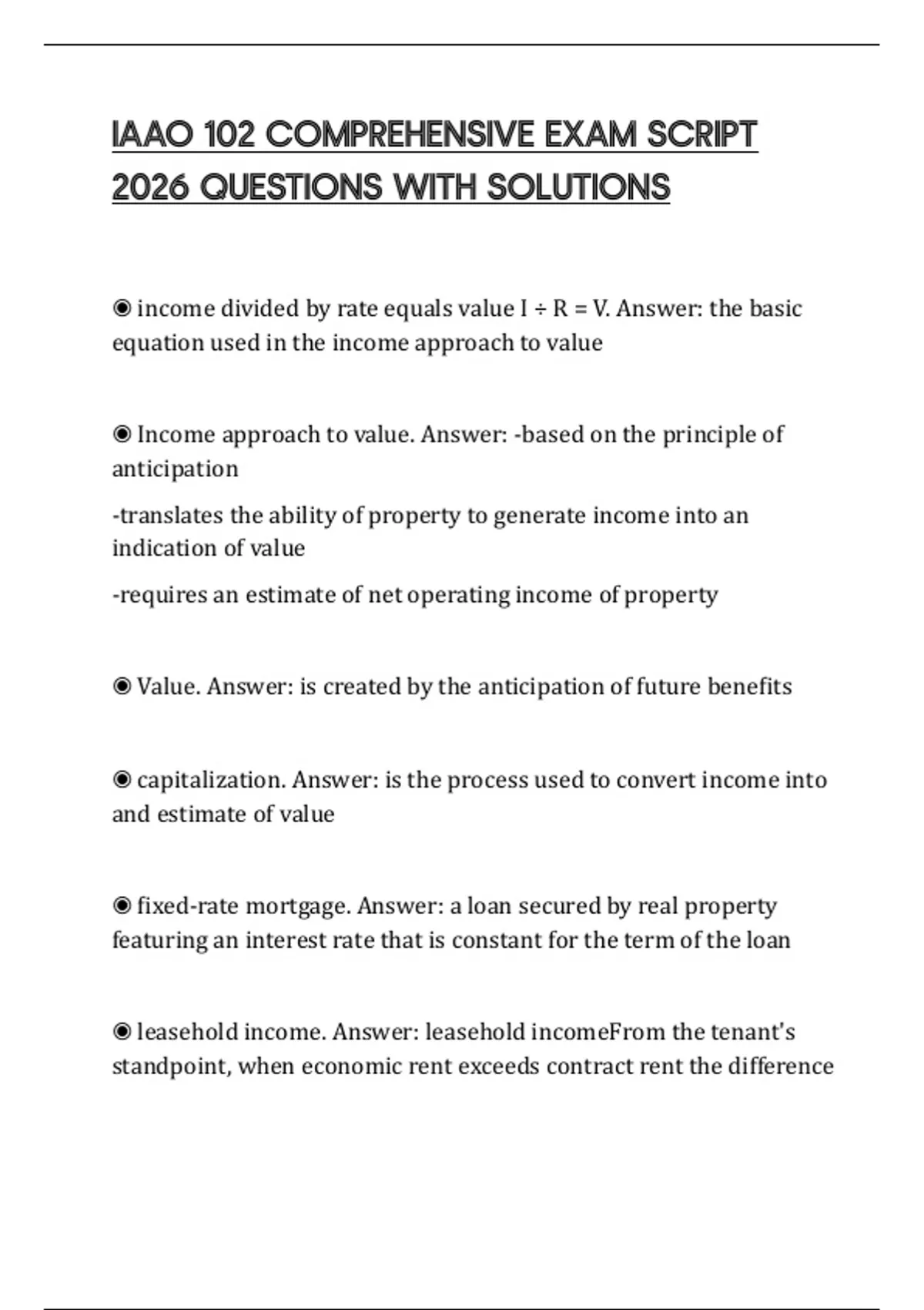 ◉ Income approach to value. Answer: -based on the principle of