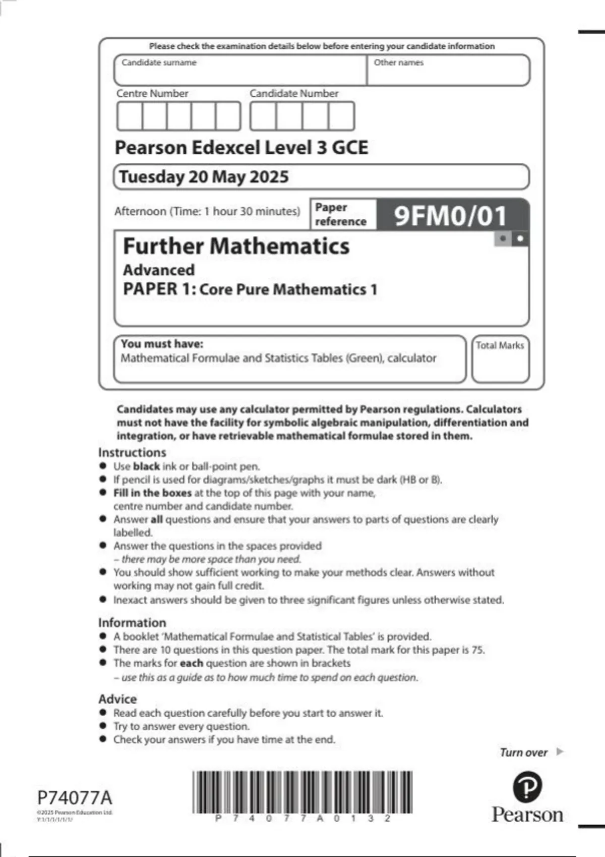Pearson Edexcel a level Further Mathematics |question paper |2025|9FM0/01