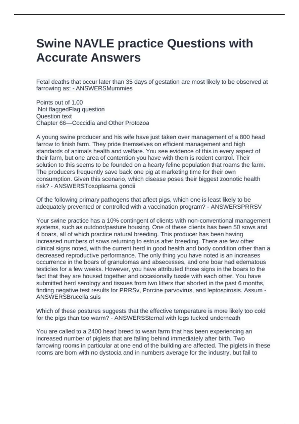 Fetal deaths that occur later than 35 days of gestation are most likely to be observed at farrowing as: - ANSWERSMummies Points out of 1.00 Not flaggedFlag question Question text Chapter 66—Coccidia and Other Protozoa A young swine producer and his wife have just taken over management of a 800 head farrow to finish farm. They pride themselves on efficient management and high standards of animals health and welfare. You see evidence of this in every aspect of their farm, but one area of contention you have with them is rodent control. Their solution to this seems to be founded on a hearty feline population that roams the farm. The producers frequently save back one pig at marketing time for their own consumption. Given this scenario, which disease poses their biggest zoonotic health risk? - ANSWERSToxoplasma gondii Of the following primary pathogens that affect pigs, which one is least likely to be adequately prevented or controlled with a vaccination program? - ANSWERSPRRSV Your swine practice has a 10% contingent of clients with non-conventional management systems, such as outdoor/pasture housing. One of these clients has been 50 sows and 4 boars, all of which practice natural breeding. This producer has been having increased numbers of sows returning to estrus after breeding. There are few other clinical signs noted, with the current herd in good health and body condition other than a decreased reproductive performance. The only thing you have noted is an increases occurrence in the boars of granulomas and absecesses, and one boar had edematous testicles for a few weeks. However, you have attributed those signs in the boars to the fact that they are housed together and occasionally tussle with each other. You have submitted herd serology and tissues from two litters that aborted in the past 6 months, finding negative test results for PRRSv, Porcine parvovirus, and leptospirosis. Assum - ANSWERSBrucella suis Which of these postures suggests that the effective temperature is more likely too cold for the pigs than too warm? - ANSWERSSternal with legs tucked underneath You are called to a 2400 head breed to wean farm that has been experiencing an increased number of piglets that are falling behind immediately after birth. Two farrowing rooms in particular at one end of the building are affected. The piglets in these rooms are born with no dystocia and in numbers average for the industry, but fail to thrive the first 3-4 days of life. When you examine the piglets, you can see they have a gaunt appearance, are underweight for their age, remain close to the sow even when not feeding, and some minor diarrhea is noted. Before examining the females, you run through a list of differentials. Which of the following factors is least likely to be influencing the females' poor milk production? - ANSWERSHigh levels of fiber in the lactation feed
