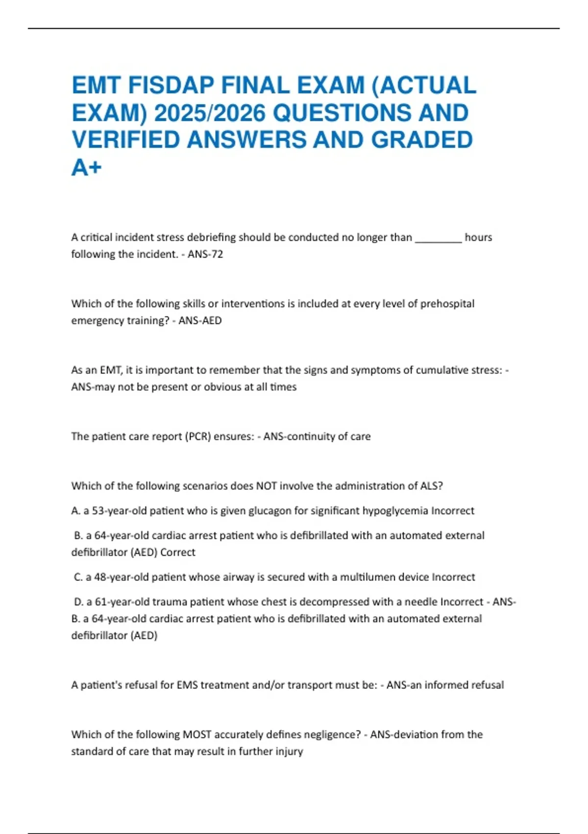 EMT FISDAP FINAL EXAM (ACTUAL EXAM) 2025/2026 QUESTIONS AND VERIFIED ANSWERS AND GRADED A+