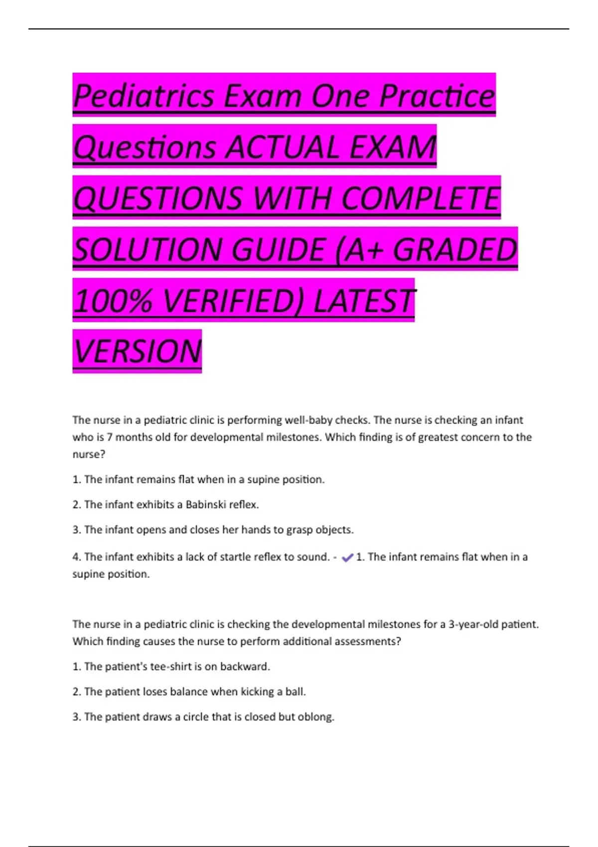 Pediatrics Exam One Practice Questions ACTUAL EXAM QUESTIONS WITH COMPLETE SOLUTION GUIDE (A+ GRADED 100% VERIFIED) LATEST VERSION