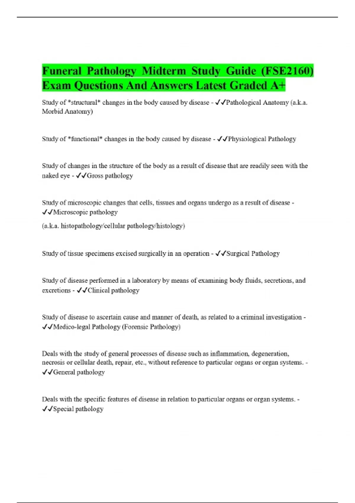 Funeral Pathology Midterm Study Guide (FSE2160) Exam Questions And Answers Latest Graded A+