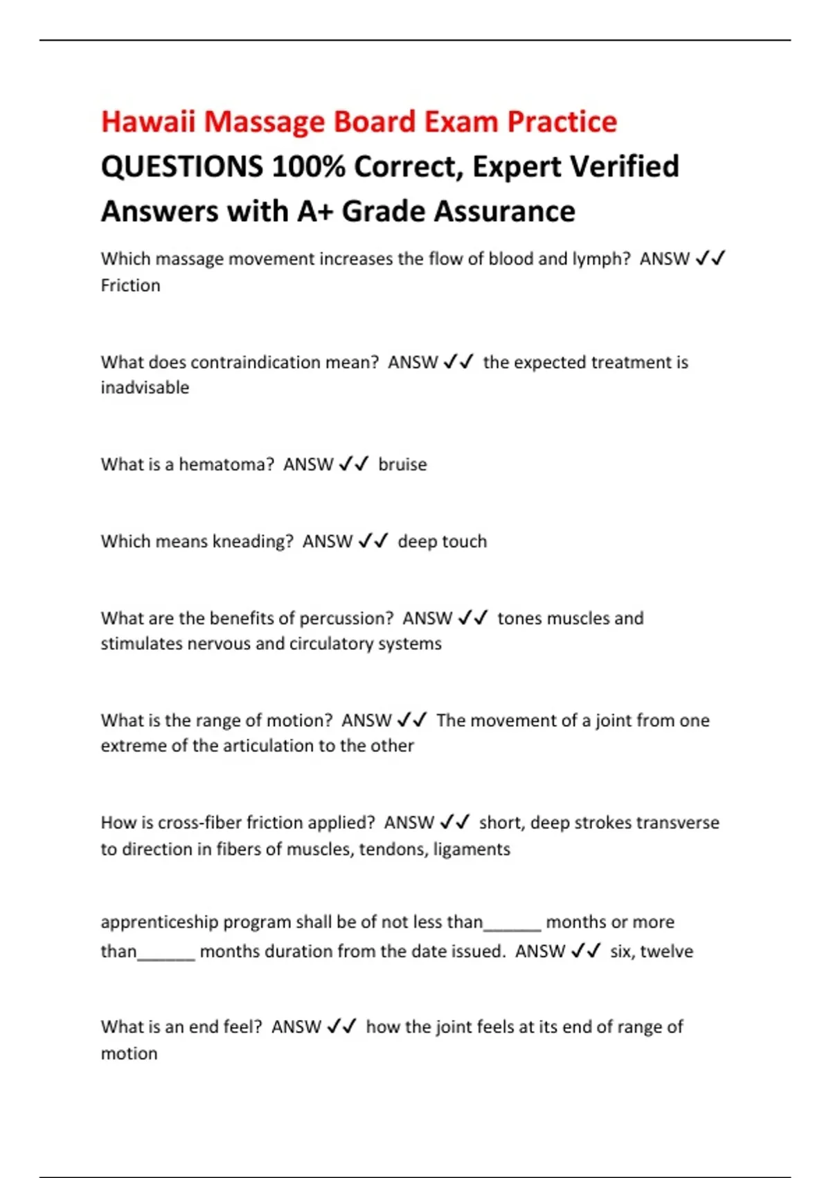 Hawaii Massage Board Exam Practice QUESTIONS 100% Correct, Expert Verified Answers with A+ Grade Assurance