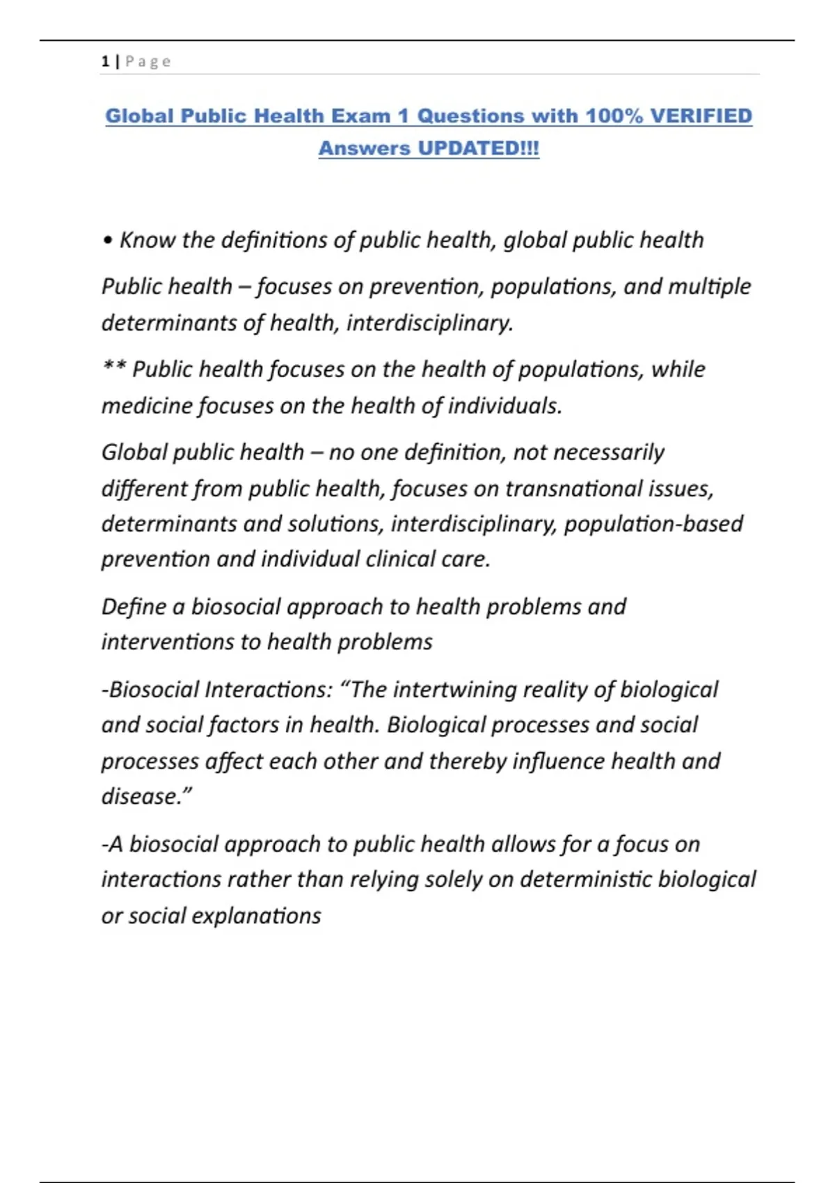 Global Public Health Exam 1 Questions with 100% VERIFIED Answers UPDATED!!!.