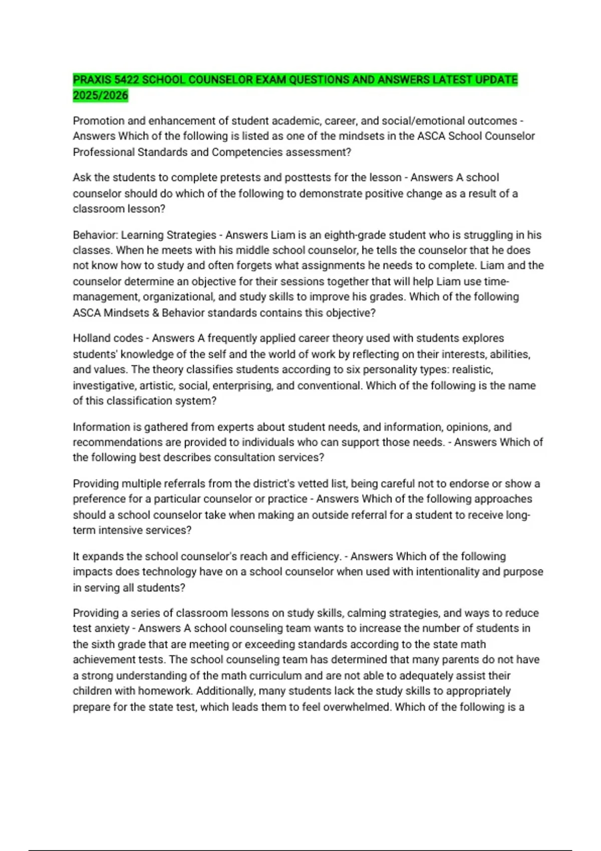 PRAXIS 5422 SCHOOL COUNSELOR EXAM QUESTIONS AND ANSWERS LATEST UPDATE 2025/2026 Promotion and enhancement of student academic, career, and social/emotional outcomes - Answers Which of the following is listed as one of the mindsets in the ASCA School Counselor Professional Standards and Competencies assessment? Ask the students to complete pretests and posttests for the lesson - Answers A school counselor should do which of the following to demonstrate positive change as a result of a classroom lesson? Behavior: Learning Strategies - Answers Liam is an eighth-grade student who is struggling in his classes. When he meets with his middle school counselor, he tells the counselor that he does not know how to study and often forgets what assignments he needs to complete. Liam and the counselor determine an objective for their sessions together that will help Liam use time-management, organizational, and study skills to improve his grades. Which of the following ASCA Mindsets & Behavior standards contains this objective? Holland codes - Answers A frequently applied career theory used with students explores students' knowledge of the self and the world of work by reflecting on their interests, abilities, and values. The theory classifies students according to six personality types: realistic, investigative, artistic, social, enterprising, and conventional. Which of the following is the name of this classification system? Information is gathered from experts about student needs, and information, opinions, and recommendations are provided to individuals who can support those needs. - Answers Which of the following best describes consultation services? Providing multiple referrals from the district's vetted list, being careful not to endorse or show a preference for a particular counselor or practice - Answers Which of the following approaches should a school counselor take when making an outside referral for a student to receive long-term intensive services? It expands the school counselor's reach and efficiency. - Answers Which of the following impacts does technology have on a school counselor when used with intentionality and purpose in serving all students? Providing a series of classroom lessons on study skills, calming strategies, and ways to reduce test anxiety - Answers A school counseling team wants to increase the number of students in the sixth grade that are meeting or exceeding standards according to the state math achievement tests. The school counseling team has determined that many parents do not have a strong understanding of the math curriculum and are not able to adequately assist their children with homework. Additionally, many students lack the study skills to appropriately prepare for the state test, which leads them to feel overwhelmed. Which of the following is a direct service the school counseling team can provide to help meet the goal? Partnering with families, teachers, and administrators on a school counseling advisory council in order to elicit feedback on the goal - Answers A school counseling team wants to decrease the number of students with two or more failing grades from 50 students in the first semester of the year to 45 students in the second semester. Which of the following services correctly describes a collaborative indirect approach that would support the department's goal? Allowing his personal biases to affect his practice of school counseling - Answers Mr. Marris, a school counselor, has different cultural values than a student who is assigned to his caseload. The school counselor explains to his supervisor that he does not think he can work with the student due to a value clash. Mr. Marris is doing which of the following? Monitor their emotional and physical health and practice wellness - Answers According to the ASCA Ethical Standards for School Counselors, to ensure optimal professional effectiveness and competency, school counselors are expected to do which of the following? A legal rule that protects communications within the counseling relationship from compelled disclosure in a court proceeding - Answers Which of the following best describes privileged communication? An inappropriate school counselor activity - Answers A principal asks the school counselor to supervise lunch duty every day for ninth- and tenth-grade lunch periods. Which of the following best describes the principal's request? Obtaining informed consent, consultation, and supervision, and documenting the nature of the interactions that extend the boundaries of the counseling relationship - Answers A school counselor is asked by the administration to coach the school's volleyball team. Several students on the team are also on the school counselor's caseload. If the school counselor chooses to accept the coaching position, which of the following is the most appropriate action to take? To identify the strengths and weaknesses of the school counseling program and provide direction for program improvement - Answers Which of the following is the purpose of assessing a school counseling program? Provide the student referrals to relevant community resources. - Answers It becomes evident that a student a school counselor is seeing for individual counseling requires long-term therapy. As a result, the school counselor should do which of the following? Provide a free appropriate public education in the least restrictive environment for all students - Answers The Individuals with Disabilities Education Act (IDEA) requires public schools to do which of the following? Respect the student's autonomous decision and values, but remind her that she has options if she changes her mind later. - Answers A school counselor meets with a high school senior for