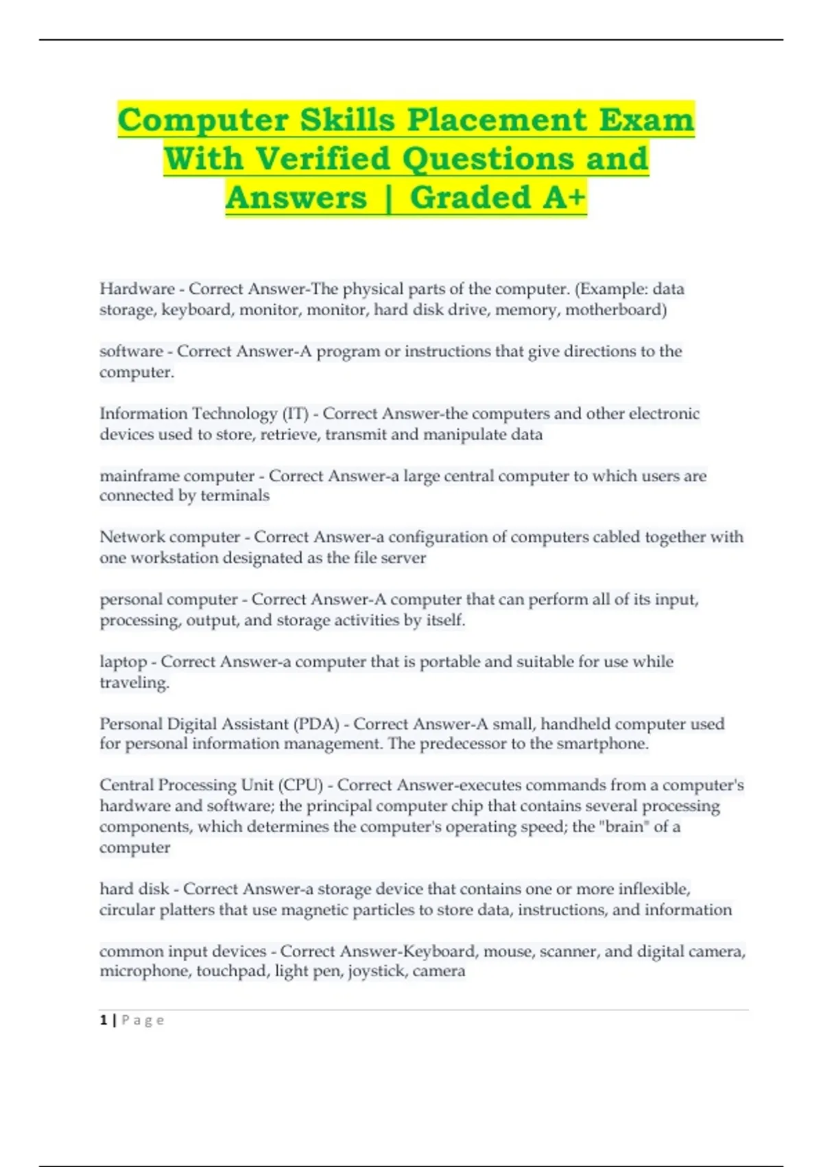 Hardware - Correct Answer-The physical parts of the computer. (Example: data storage, keyboard, monitor, monitor, hard disk drive, memory, motherboard) software - Correct Answer-A program or instructions that give directions to the computer. Information Technology (IT) - Correct Answer-the computers and other electronic devices used to store, retrieve, transmit and manipulate data mainframe computer - Correct Answer-a large central computer to which users are connected by terminals Network computer - Correct Answer-a configuration of computers cabled together with one workstation designated as the file server personal computer - Correct Answer-A computer that can perform all of its input, processing, output, and storage activities by itself. laptop - Correct Answer-a computer that is portable and suitable for use while traveling. Personal Digital Assistant (PDA) - Correct Answer-A small, handheld computer used for personal information management. The predecessor to the smartphone.