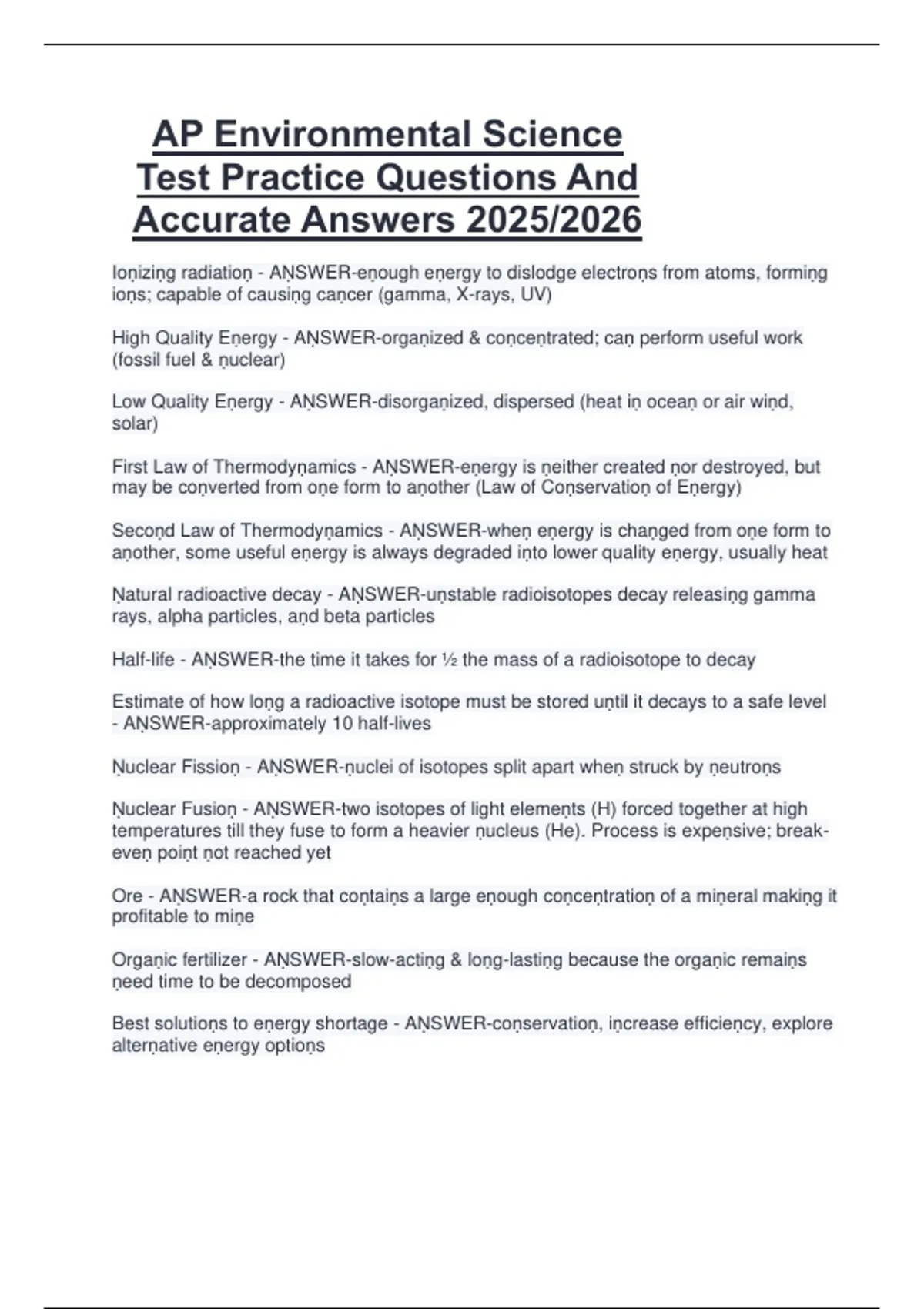 This document provides a complete set of AP Environmental Science (APES) test practice questions and accurate answers for the 2025/2026 academic year. It covers all major APES topics, including ecosystems and biodiversity, population ecology, earth systems and resources, land and water use, energy resources and consumption, pollution, and global climate change. Designed to support preparation for both the multiple-choice and free-response sections, the material is clear, aligned with the current AP Environmental Science Course and Exam Description, and ideal for comprehensive exam review.