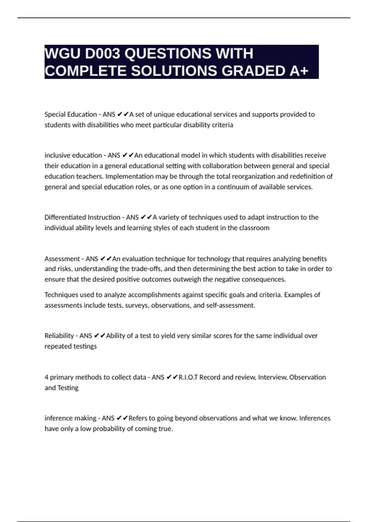 Differentiated Instruction - ANS ✔✔A variety of techniques used to adapt instruction to the