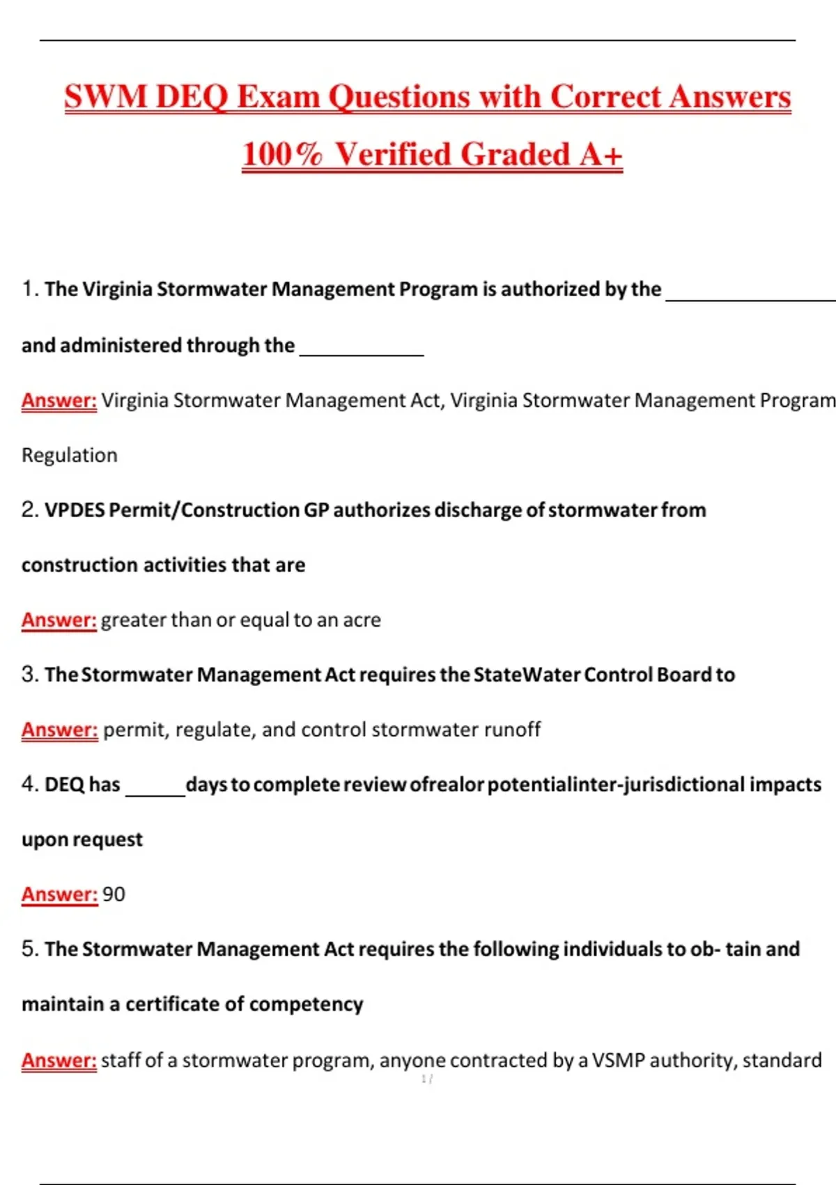 Complete SWM DEQ Exam Pack with fully verified, 100% correct questions and answers. Ideal for stormwater operators, inspectors, and environmental compliance professionals preparing for DEQ certification. Accurate, updated, and easy to revise with.