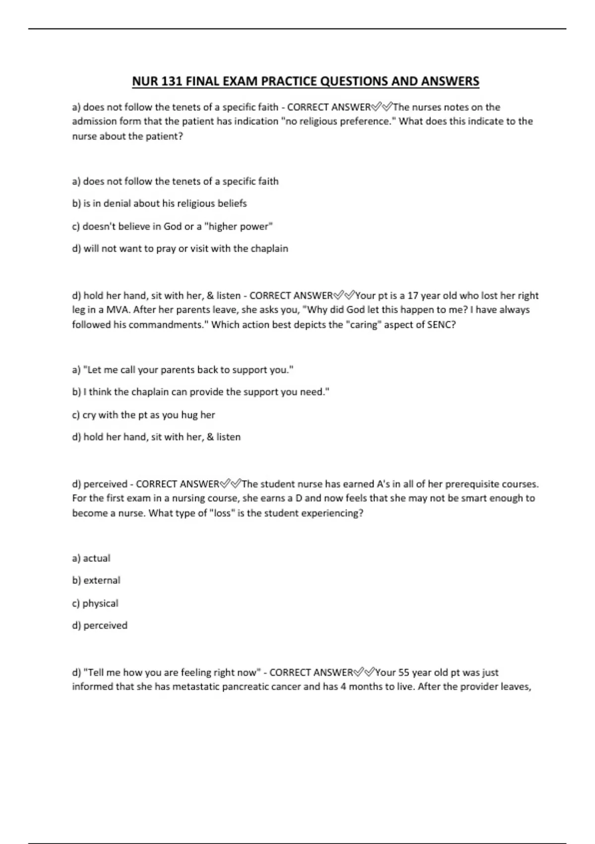 NUR 131 FINAL EXAM PRACTICE QUESTIONS AND ANSWERS a) does not follow the tenets of a specific faith - CORRECT ANSWERThe nurses notes on the admission form that the patient has indication "no religious preference." What does this indicate to the nurse about the patient? a) does not follow the tenets of a specific faith b) is in denial about his religious beliefs c) doesn't believe in God or a "higher power" d) will not want to pray or visit with the chaplain
