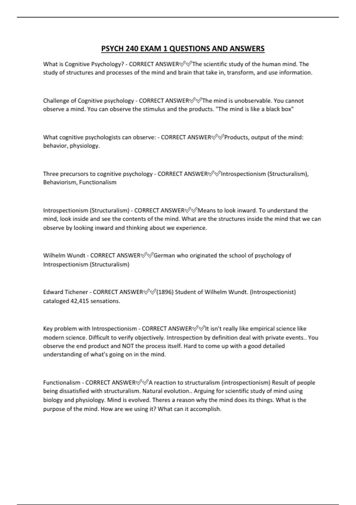 PSYCH 240 EXAM 1 QUESTIONS AND ANSWERS What is Cognitive Psychology? - CORRECT ANSWERThe scientific study of the human mind. The study of structures and processes of the mind and brain that take in, transform, and use information.