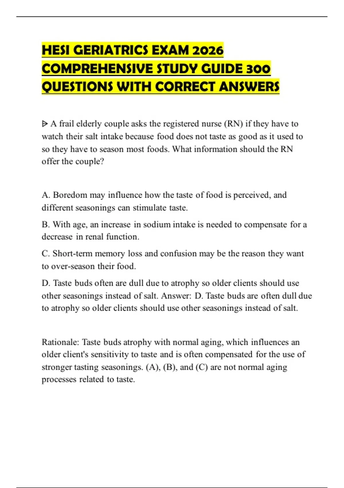 HESI GERIATRICS EXAM 2026 COMPREHENSIVE STUDY GUIDE 300 QUESTIONS WITH CORRECT ANSWERS