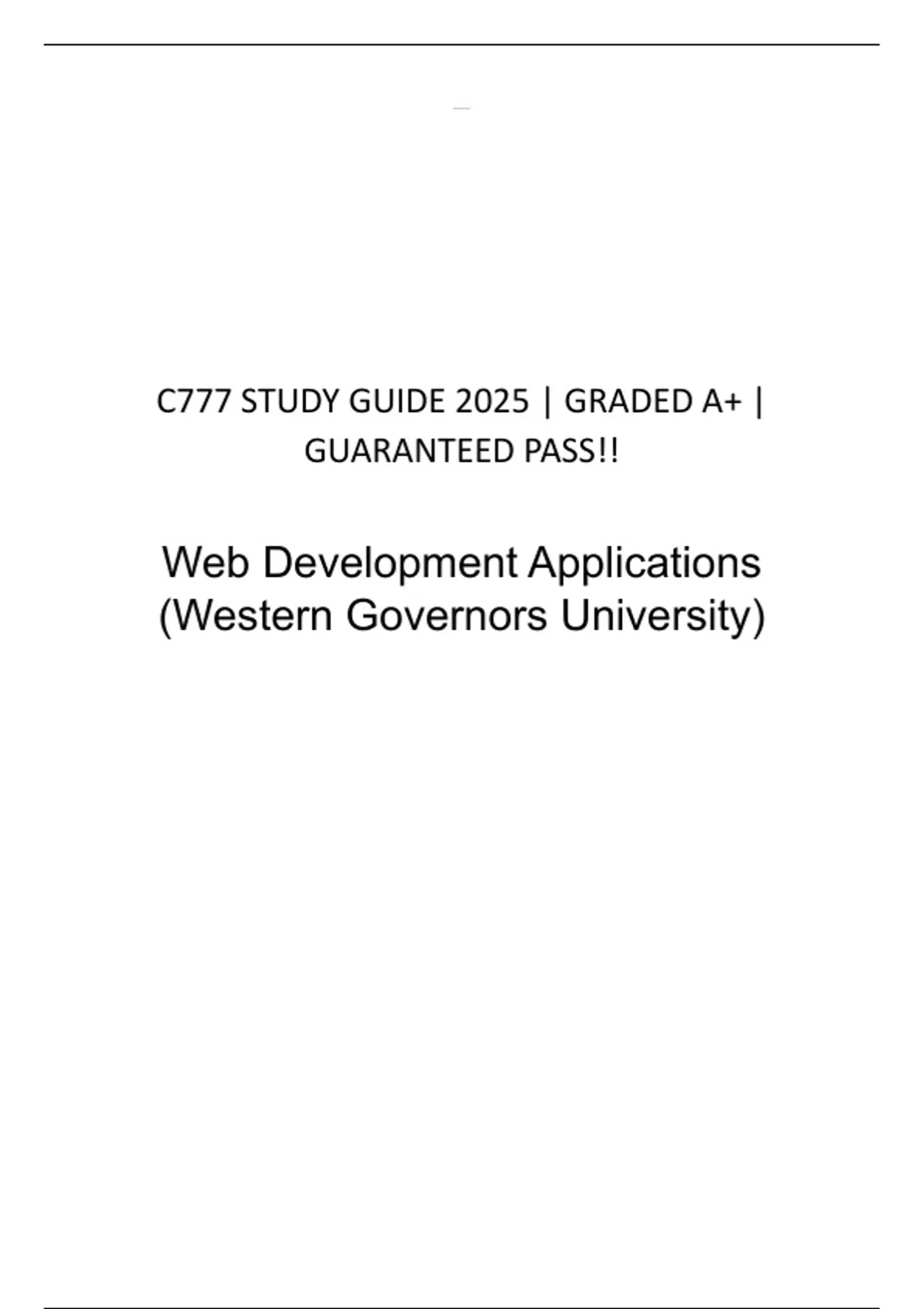 Ace Your C777 Exam & Master Modern Web Development! Struggling to condense the vast curriculum of C777? Look no further! This is the ULTIMATE, GRADED A+ study guide meticulously crafted to help you GUARANTEED PASS the challenging Web Development Applications course. This document is your all-in-one resource to conquer the core technologies of front-end web development. We've distilled hundreds of pages of material into clear, concise, and powerful notes that are perfect for last-minute revision or building a strong foundational understanding. What You Get Inside: Master the Trifecta: In-depth coverage of HTML5, CSS3, and JavaScript, the essential building blocks of the modern web. DOMinate the Browser: Clear explanations of the Document Object Model (DOM) and how to create dynamic, interactive web pages. Unlock Powerful APIs: Demystify complex topics like the Canvas API, Geolocation, Drag-and-Drop, and Offline Web Apps. Build Responsive Designs: Expert tips on Responsive Web Design (RWD), CSS Media Queries, and Fluid Grids to ensure your sites look perfect on any device. Create Modern Forms: A comprehensive breakdown of HTML5 form elements, input types, and built-in validation for a seamless user experience. Conquer Key Concepts: From CSS Flexbox/Grid and jQuery basics to JavaScript functions, events, and error debugging, it's all covered. Tailored for Success at WGU and Beyond: Specifically aligned with the WGU C777 course objectives, these notes are also the perfect study companion for anyone pursuing a CIW (Certified Internet Web Professional) certification or a similar front-end developer program at any university. The unit code C777 (Web Development Applications) is highly sought after in IT and Computer Science degrees. Stop the endless searching and information overload. Invest in your success and download these notes today to pass your exam with confidence!