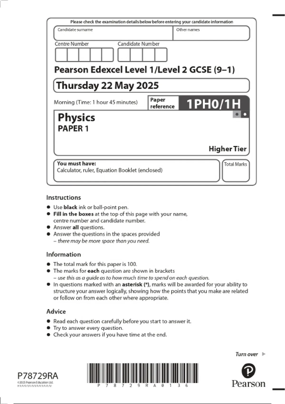 2025 Pearson Edexcel Level 1/Level 2 GCSE (9–1) Physics PAPER 1 Higher Tier Combined Question Paper and Final Marking Scheme