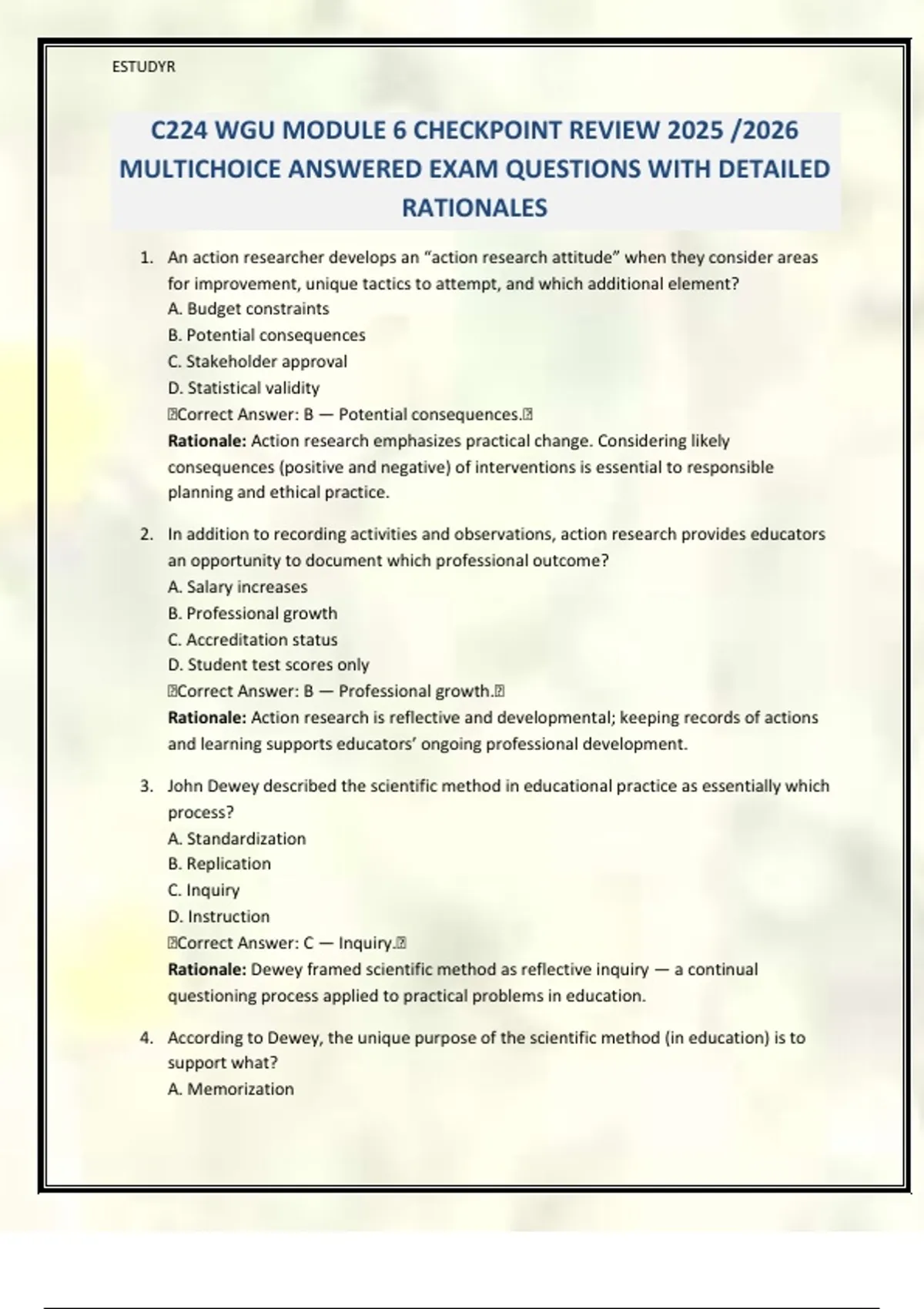 4. According to Dewey, the unique purpose of the scientific method (in education) is to