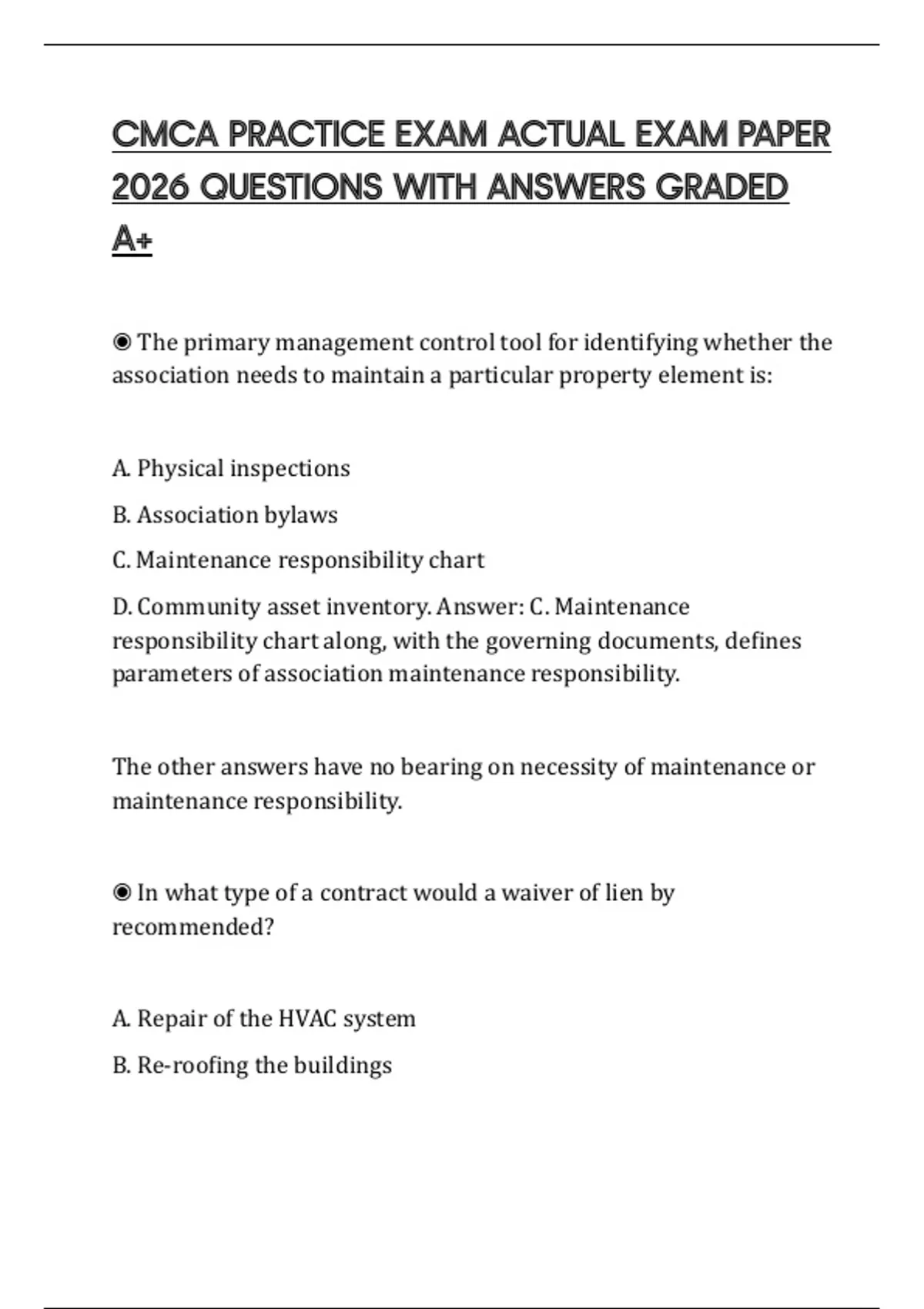 CMCA PRACTICE EXAM ACTUAL EXAM PAPER 2026 QUESTIONS WITH ANSWERS GRADED A+