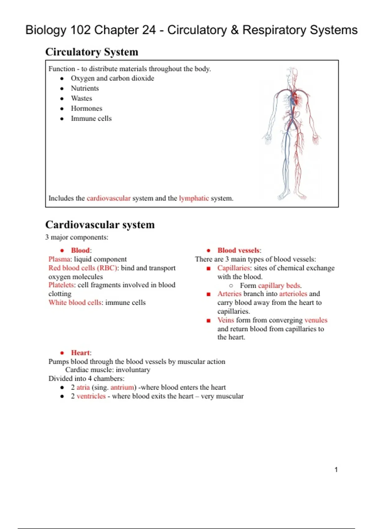 Biology 102 Chapter 24 - Circulatory & Respiratory Systems