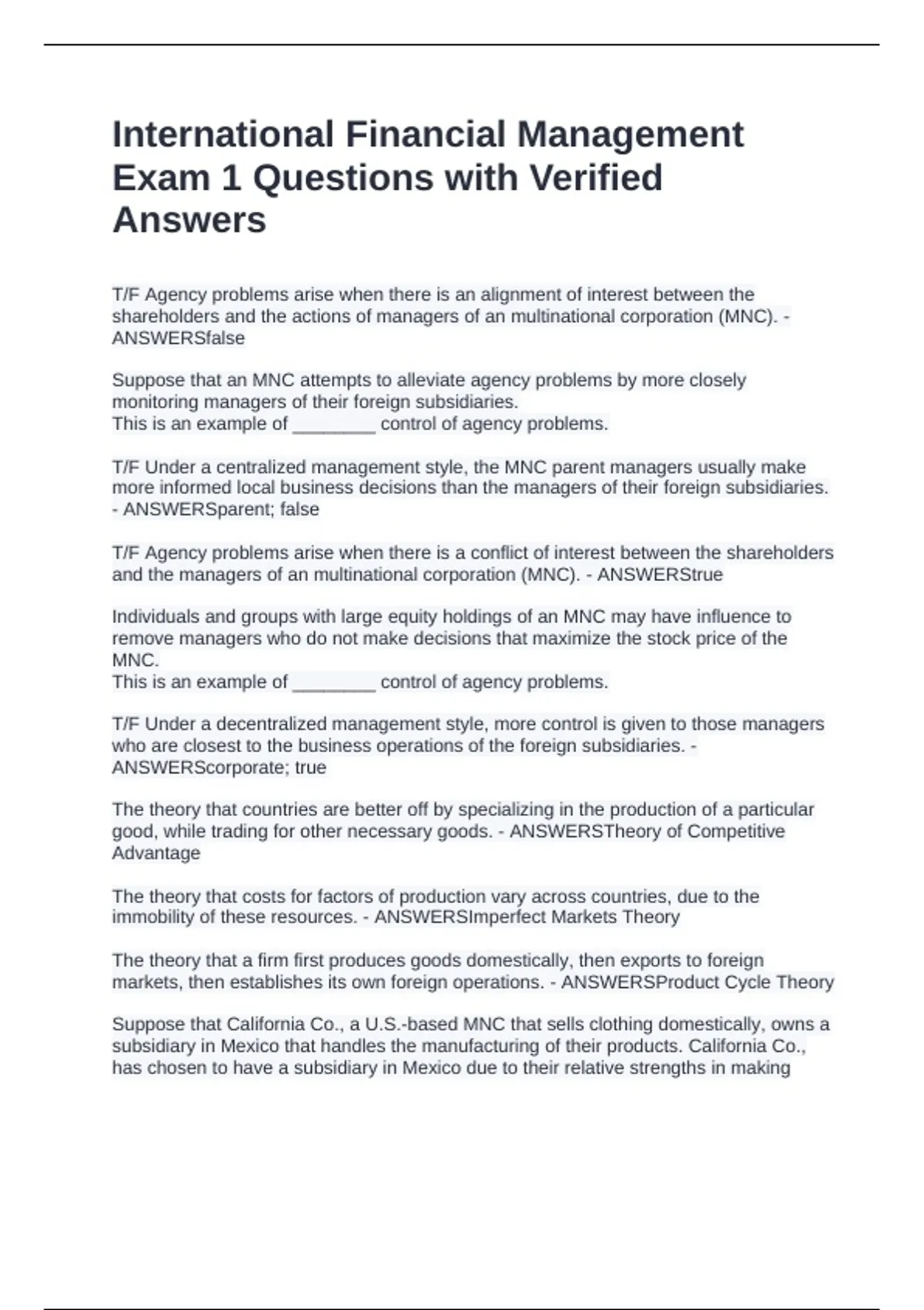 T/F Agency problems arise when there is an alignment of interest between the shareholders and the actions of managers of an multinational corporation (MNC). - ANSWERSfalse Suppose that an MNC attempts to alleviate agency problems by more closely monitoring managers of their foreign subsidiaries. This is an example of ________ control of agency problems. T/F Under a centralized management style, the MNC parent managers usually make more informed local business decisions than the managers of their foreign subsidiaries. - ANSWERSparent; false T/F Agency problems arise when there is a conflict of interest between the shareholders and the managers of an multinational corporation (MNC). - ANSWERStrue Individuals and groups with large equity holdings of an MNC may have influence to remove managers who do not make decisions that maximize the stock price of the MNC. This is an example of ________ control of agency problems. T/F Under a decentralized management style, more control is given to those managers who are closest to the business operations of the foreign subsidiaries. - ANSWERScorporate; true The theory that countries are better off by specializing in the production of a particular good, while trading for other necessary goods. - ANSWERSTheory of Competitive Advantage The theory that costs for factors of production vary across countries, due to the immobility of these resources. - ANSWERSImperfect Markets Theory The theory that a firm first produces goods domestically, then exports to foreign markets, then establishes its own foreign operations. - ANSWERSProduct Cycle Theory