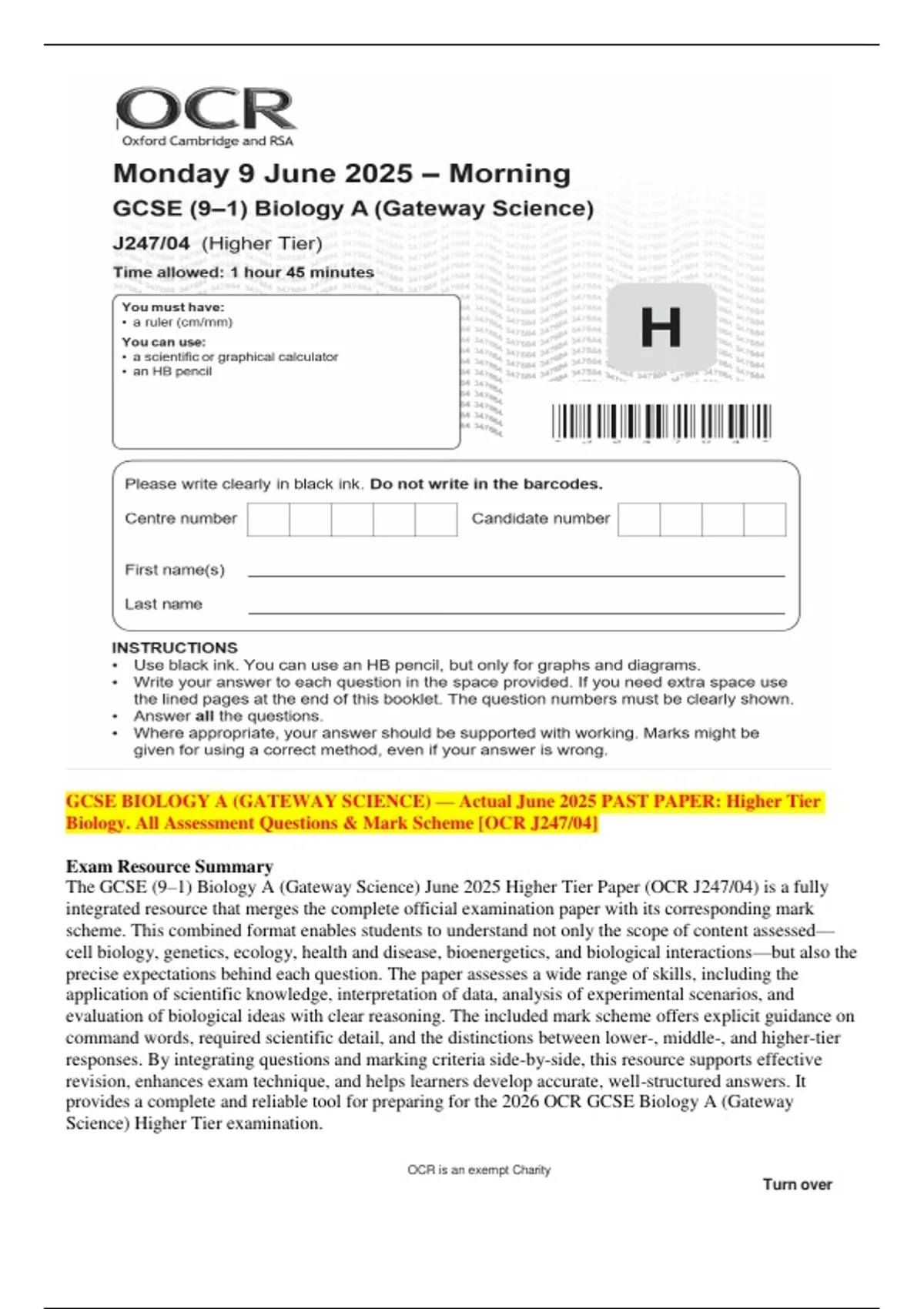 GCSE BIOLOGY A (GATEWAY SCIENCE) — Actual June 2025 PAST PAPER: Higher Tier Biology. All Assessment Questions & Mark Scheme [OCR J247/04] Exam Resource Summary The GCSE (9–1) Biology A (Gateway Science) June 2025 Higher Tier Paper (OCR J247/04) is a fully integrated resource that merges the complete official examination paper with its corresponding mark scheme. This combined format enables students to understand not only the scope of content assessed— cell biology, genetics, ecology, health and disease, bioenergetics, and biological interactions—but also the precise expectations behind each question. The paper assesses a wide range of skills, including the application of scientific knowledge, interpretation of data, analysis of experimental scenarios, and evaluation of biological ideas with clear reasoning. The included mark scheme offers explicit guidance on command words, required scientific detail, and the distinctions between lower-, middle-, and higher-tier responses. By integrating questions and marking criteria side-by-side, this resource supports effective revision, enhances exam technique, and helps learners develop accurate, well-structured answers. It provides a complete and reliable tool for preparing for the 2026 OCR GCSE Biology A (Gateway Science) Higher Tier examinati