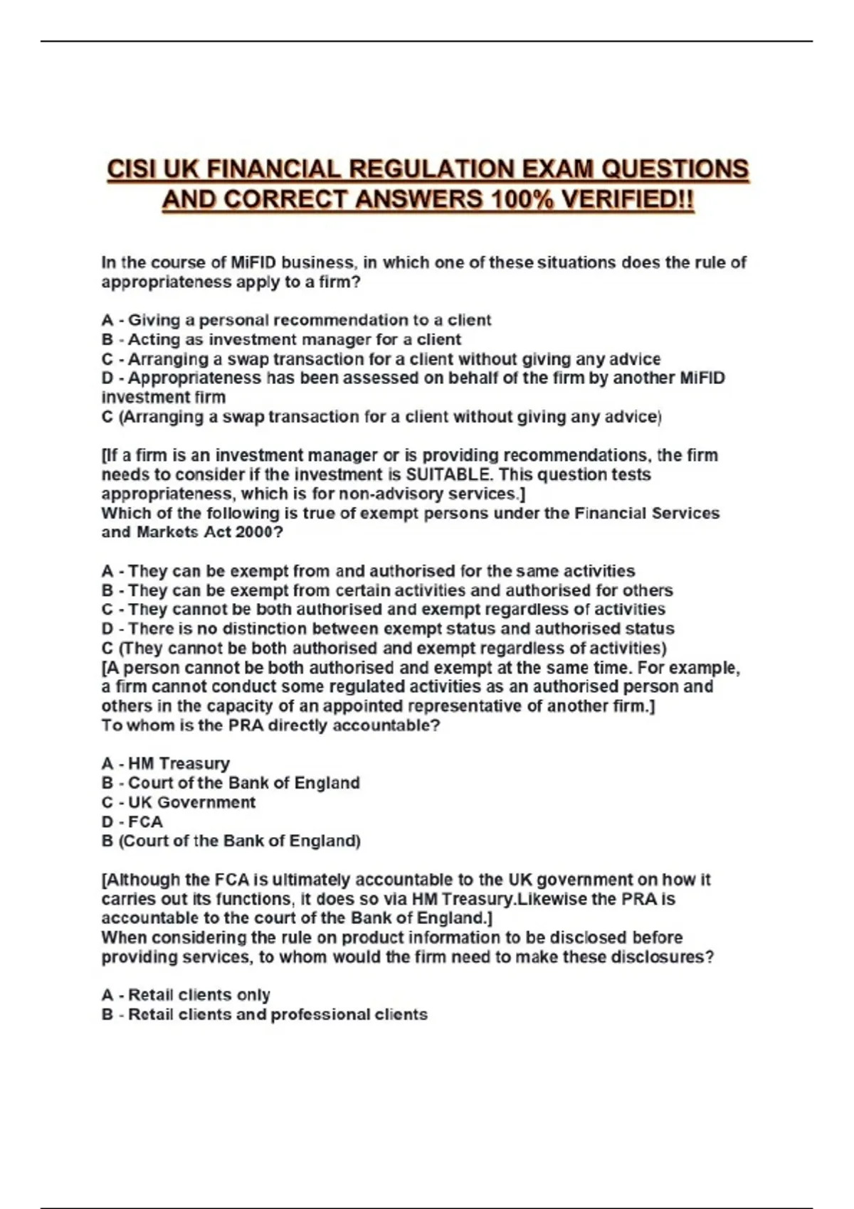 CISI UK FINANCIAL REGULATION EXAM QUESTIONS AND CORRECT ANSWERS 100% VERIFIED!!...