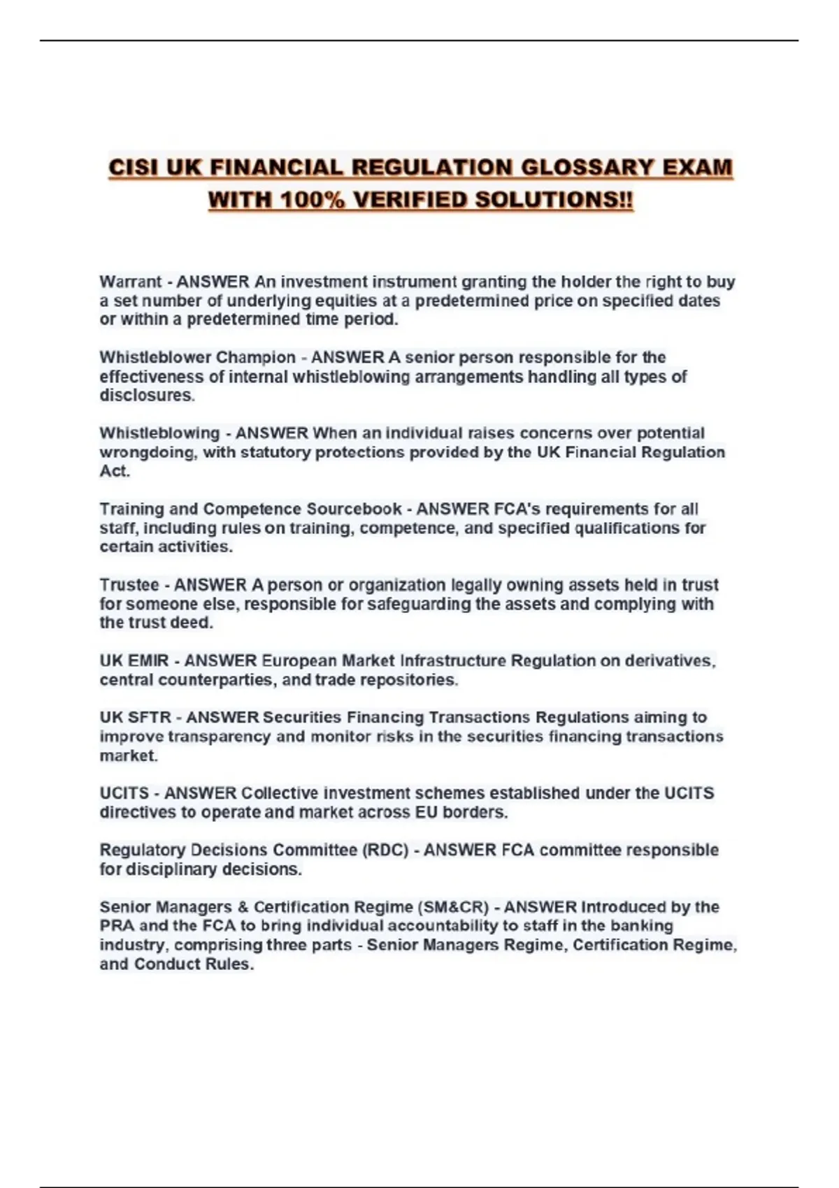 CISI UK FINANCIAL REGULATION GLOSSARY EXAM WITH 100% VERIFIED SOLUTIONS!!...