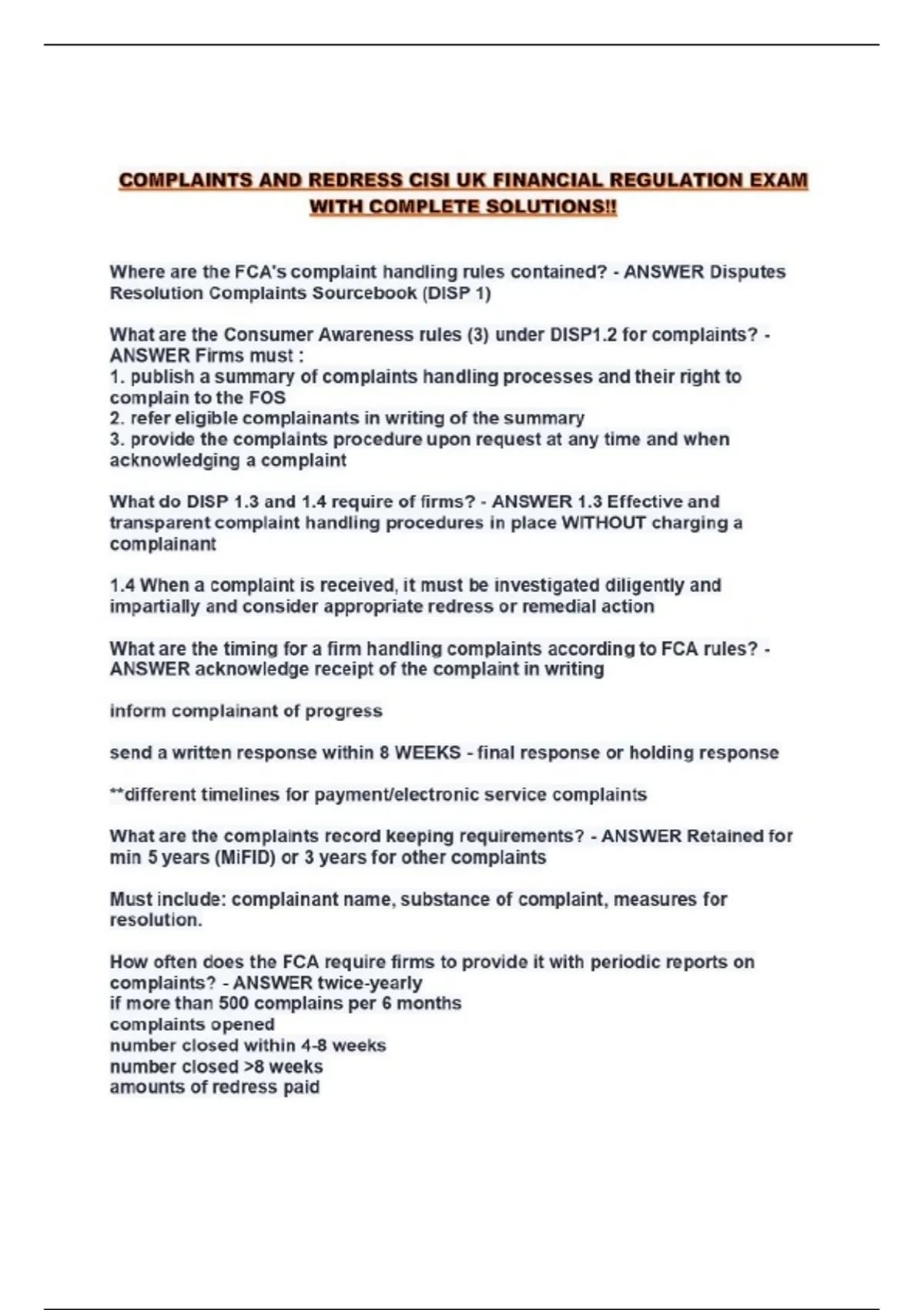 COMPLAINTS AND REDRESS CISI UK FINANCIAL REGULATION EXAM WITH COMPLETE SOLUTIONS!!...