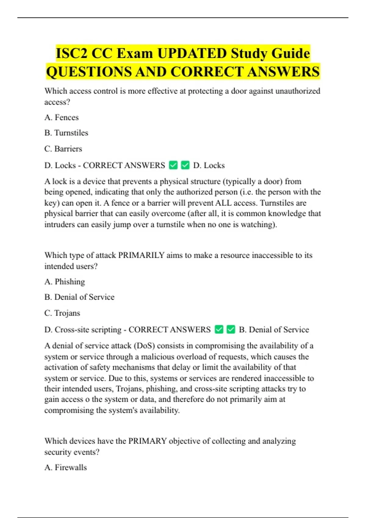 ISC2 CC Exam UPDATED Study Guide QUESTIONS AND CORRECT ANSWERS Which access control is more effective at protecting a door against unauthorized access? A. Fences B. Turnstiles C. Barriers D. Locks - CORRECT ANSWERS D. Locks A lock is a device that prevents a physical structure (typically a door) from being opened, indicating that only the authorized person (i.e. the person with the key) can open it. A fence or a barrier will prevent ALL access. Turnstiles are physical barrier that can easily overcome (after all, it is common knowledge that intruders can easily jump over a turnstile when no one is watching).