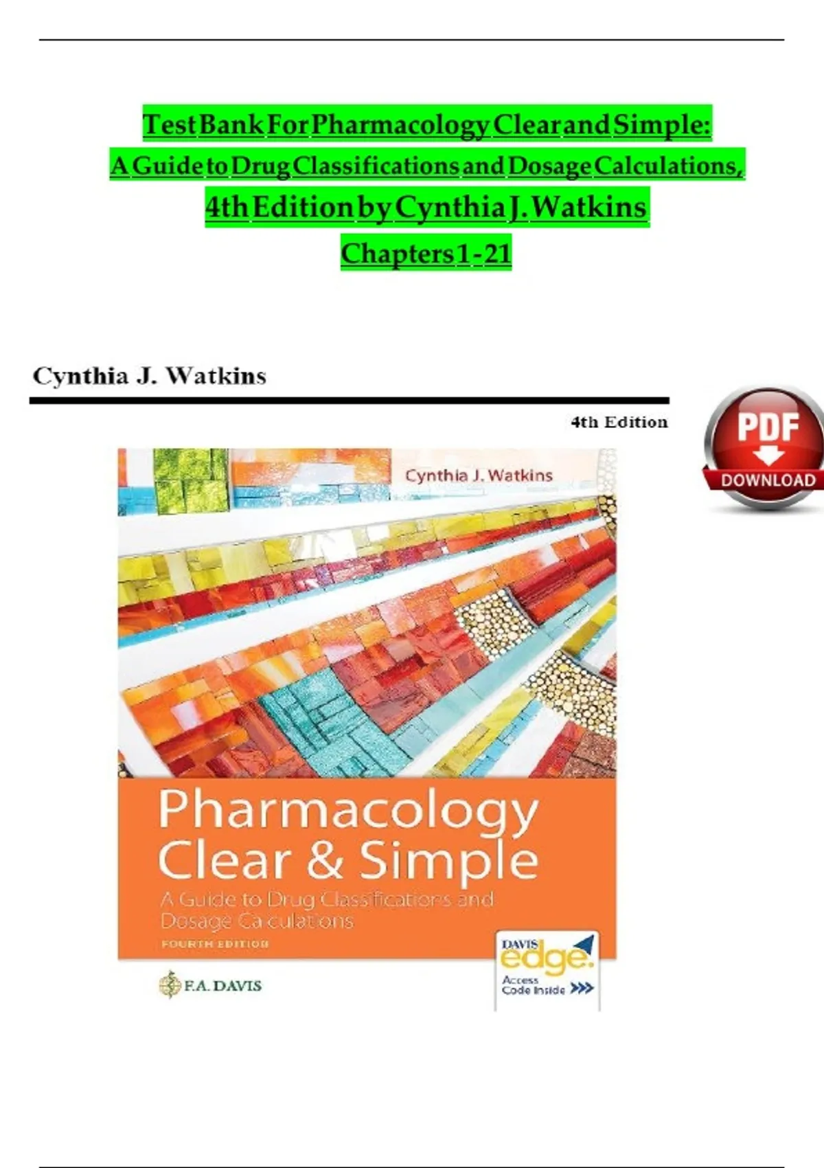 Test Bank For Pharmacology Clear and Simple A Guide to Drug Classifications and Dosage Calculations 4th Edition WatkinsTEST BANK PHARMACOLOGY CLEAR AND SIMPLE - A Guide to Drug Classifications and Dosage Calculations By Cynthia Watkins ISBN- 6528 This is a Test Bank Consists of Study Questions and solutions to help you study and prepare better for your Exams Test Bank: Pharmacology Clear and Simple: A Guide to Drug Classifications and Dosage Calculations 3rd Edition by Cynthia J. Watkins Table of Contents: Chapter 1. History of Pharmacology Chapter 2. Basics of Pharmacology Chapter 3. Patient Safety in Medication Administration Chapter 4. Regulations Chapter 5. Prescriptions and Labels II. Calculations Chapter 6. Basic Review of Mathematics Chapter 7. Measurement Systems Chapter 8. Dosage Calculations Chapter 9. Enteral Medications and Administration Chapter 10. Parenteral Medications and Administration Chapter 11. Integumentary System Medications Chapter 12. Musculoskeletal System Medications Chapter 13. Nervous System Medications Chapter 14. Eye and Ear Medications Chapter 15. Endocrine System Medications Chapter 16. Cardiovascular System Medications Chapter 17. Immunological System Medications Chapter 18. Pulmonary System Medications Chapter 19. Gastrointestinal System Medications Chapter 20. Reproductive and Urinary Systems Medications Chapter 21. Herbs, Vitamins, and MineralsTEST BANK PHARMACOLOGY CLEAR AND SIMPLE - A Guide to Drug Classifications and Dosage Calculations By Cynthia Watkins ISBN- 6528 This is a Test Bank Consists of Study Questions and solutions to help you study and prepare better for your Exams Test Bank: Pharmacology Clear and Simple: A Guide to Drug Classifications and Dosage Calculations 3rd Edition by Cynthia J. Watkins Table of Contents: Chapter 1. History of Pharmacology Chapter 2. Basics of Pharmacology Chapter 3. Patient Safety in Medication Administration Chapter 4. Regulations Chapter 5. Prescriptions and Labels II. Calculations Chapter 6. Basic Review of Mathematics Chapter 7. Measurement Systems Chapter 8. Dosage Calculations Chapter 9. Enteral Medications and Administration Chapter 10. Parenteral Medications and Administration Chapter 11. Integumentary System Medications Chapter 12. Musculoskeletal System Medications Chapter 13. Nervous System Medications Chapter 14. Eye and Ear Medications Chapter 15. Endocrine System Medications Chapter 16. Cardiovascular System Medications Chapter 17. Immunological System Medications Chapter 18. Pulmonary System Medications Chapter 19. Gastrointestinal System Medications Chapter 20. Reproductive and Urinary Systems Medications Chapter 21. Herbs, Vitamins, and Minerals