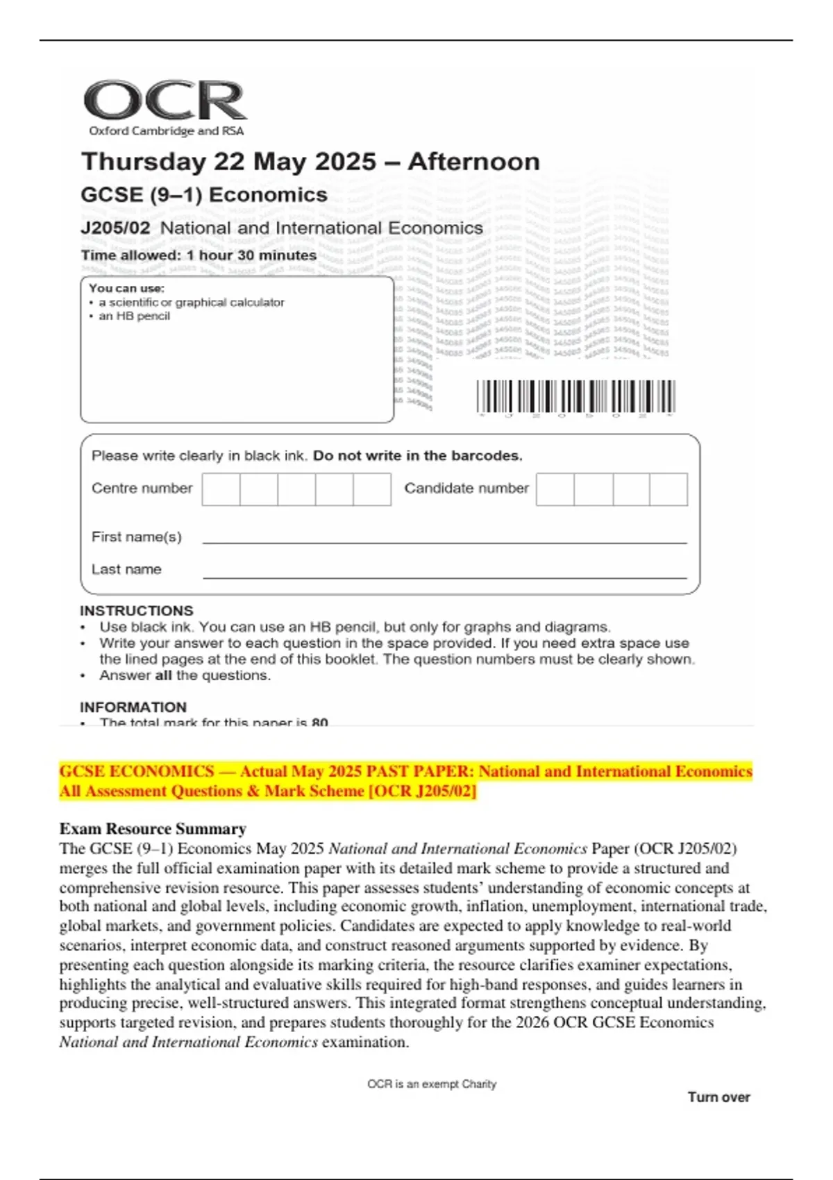 The GCSE (9–1) Economics May 2025 National and International Economics Paper (OCR J205/02)
