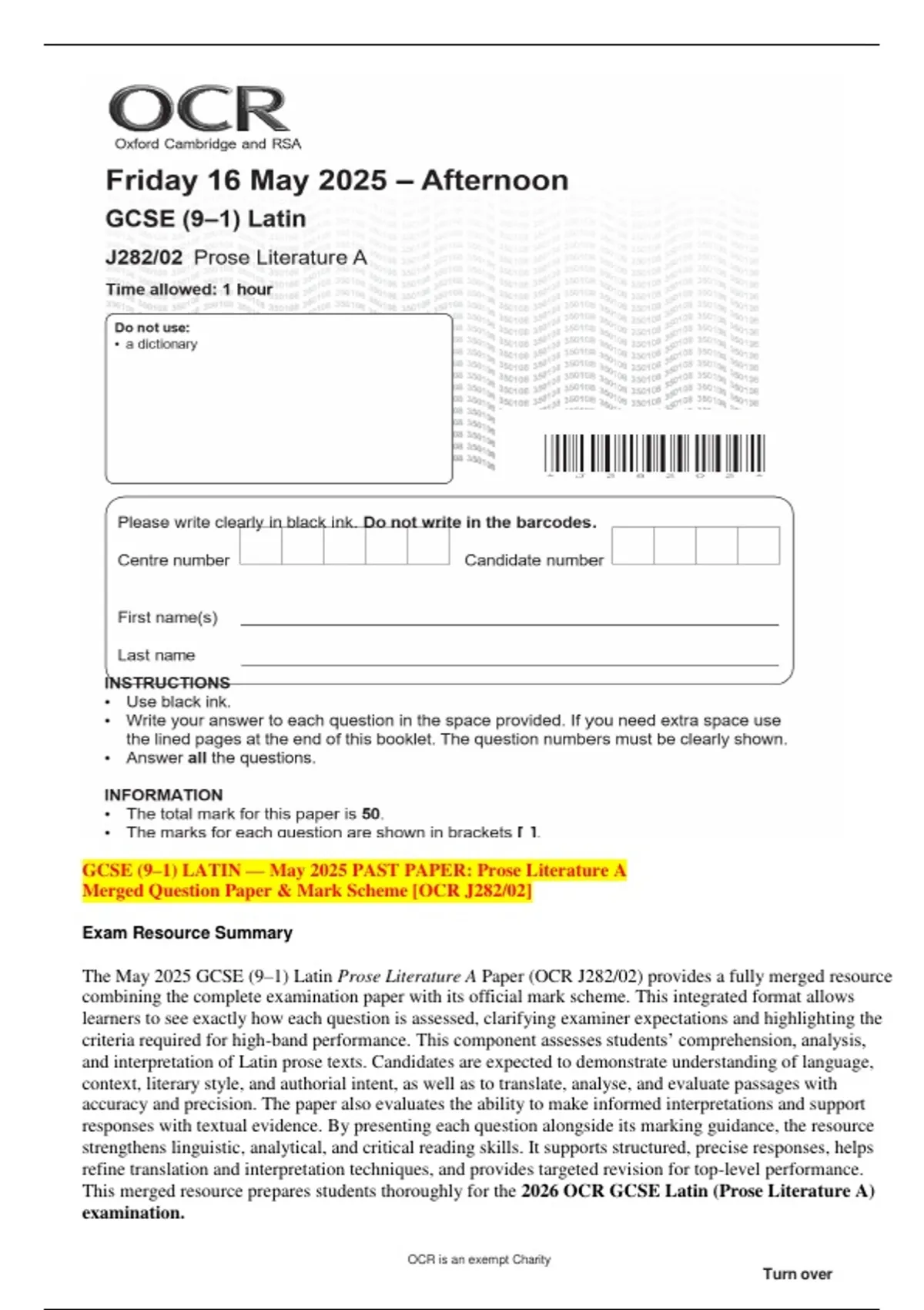 GCSE (9–1) LATIN — May 2025 PAST PAPER: Prose Literature A Merged Question Paper & Mark Scheme [OCR J282/02] Exam Resource Summary The May 2025 GCSE (9–1) Latin Prose Literature A Paper (OCR J282/02) provides a fully merged resource combining the complete examination paper with its official mark scheme. This integrated format allows learners to see exactly how each question is assessed, clarifying examiner expectations and highlighting the criteria required for high-band performance. This component assesses students’ comprehension, analysis, and interpretation of Latin prose texts. Candidates are expected to demonstrate understanding of language, context, literary style, and authorial intent, as well as to translate, analyse, and evaluate passages with accuracy and precision. The paper also evaluates the ability to make informed interpretations and support responses with textual evidence. By presenting each question alongside its marking guidance, the resource strengthens linguistic, analytical, and critical reading skills. It supports structured, precise responses, helps refine translation and interpretation techniques, and provides targeted revision for top-level performance. This merged resource prepares students thoroughly for the 2026 OCR GCSE Latin (Prose Literature
