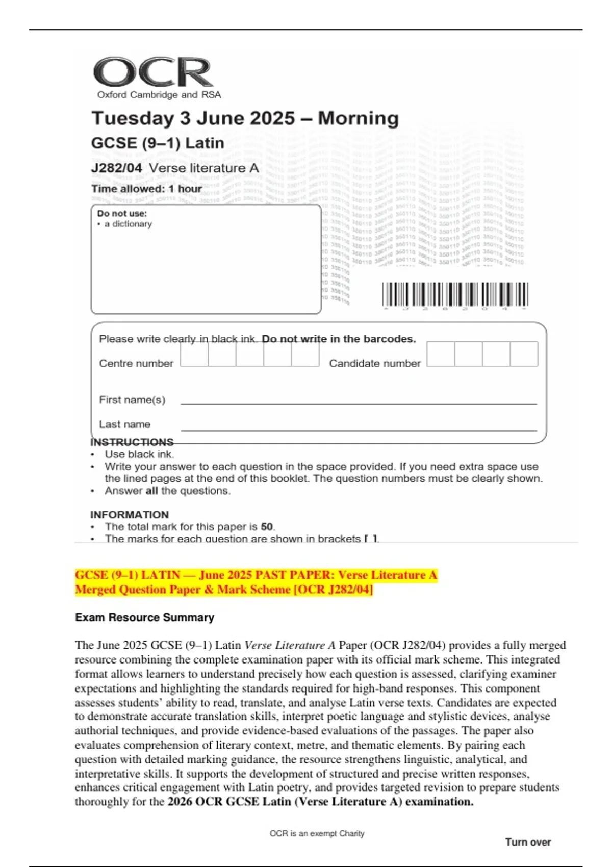 GCSE (9–1) LATIN — June 2025 PAST PAPER: Verse Literature A Merged Question Paper & Mark Scheme [OCR J282/04] Exam Resource Summary The June 2025 GCSE (9–1) Latin Verse Literature A Paper (OCR J282/04) provides a fully merged resource combining the complete examination paper with its official mark scheme. This integrated format allows learners to understand precisely how each question is assessed, clarifying examiner expectations and highlighting the standards required for high-band responses. This component assesses students’ ability to read, translate, and analyse Latin verse texts. Candidates are expected to demonstrate accurate translation skills, interpret poetic language and stylistic devices, analyse authorial techniques, and provide evidence-based evaluations of the passages. The paper also evaluates comprehension of literary context, metre, and thematic elements. By pairing each question with detailed marking guidance, the resource strengthens linguistic, analytical, and interpretative skills. It supports the development of structured and precise written responses, enhances critical engagement with Latin poetry, and provides targeted revision to prepare students thoroughly for the 2026 OCR GCSE Latin (Verse Literature A) examination