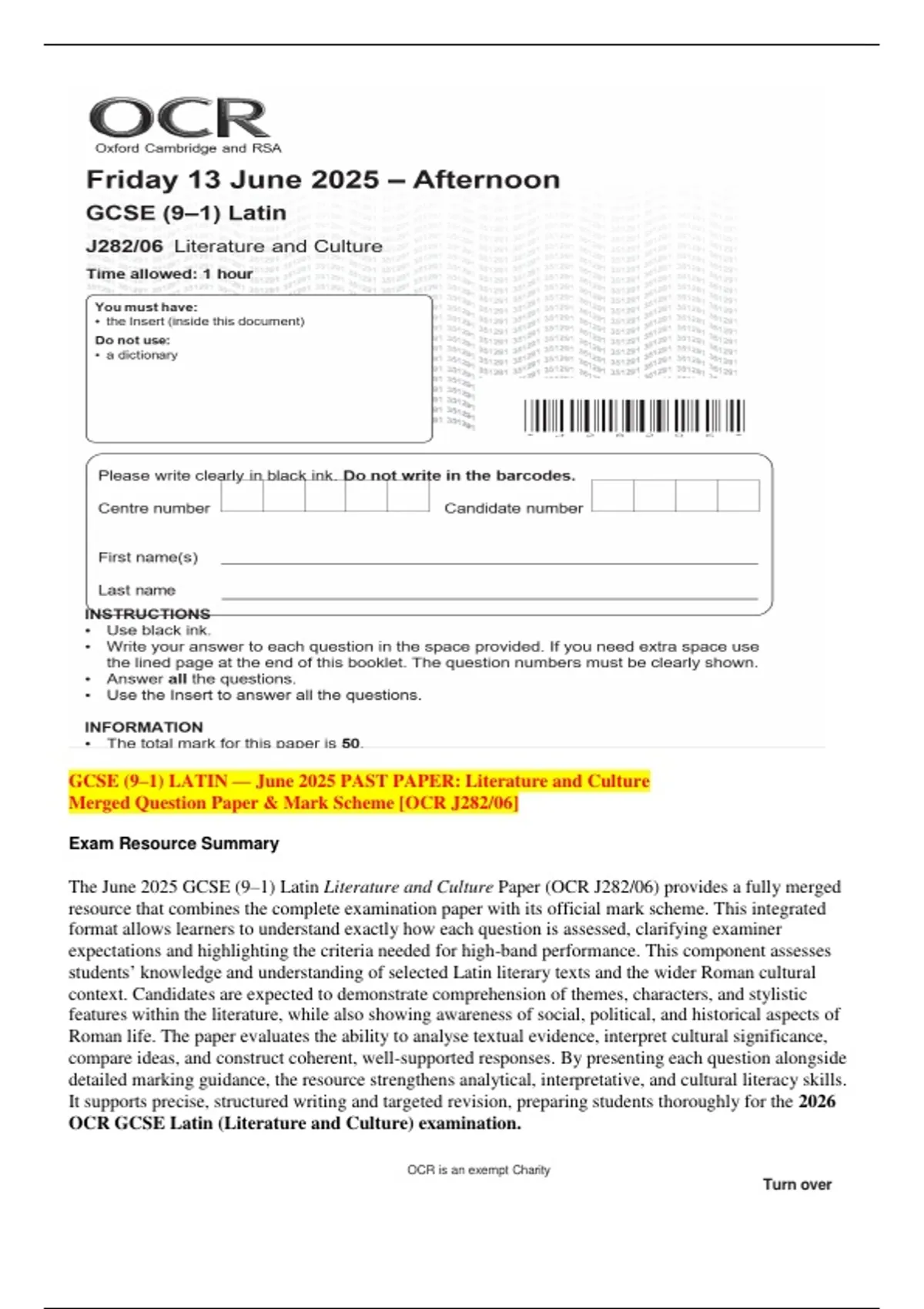 GCSE (9–1) LATIN — June 2025 PAST PAPER: Literature and Culture Merged Question Paper & Mark Scheme [OCR J282/06] Exam Resource Summary The June 2025 GCSE (9–1) Latin Literature and Culture Paper (OCR J282/06) provides a fully merged resource that combines the complete examination paper with its official mark scheme. This integrated format allows learners to understand exactly how each question is assessed, clarifying examiner expectations and highlighting the criteria needed for high-band performance. This component assesses students’ knowledge and understanding of selected Latin literary texts and the wider Roman cultural context. Candidates are expected to demonstrate comprehension of themes, characters, and stylistic features within the literature, while also showing awareness of social, political, and historical aspects of Roman life. The paper evaluates the ability to analyse textual evidence, interpret cultural significance, compare ideas, and construct coherent, well-supported responses. By presenting each question alongside detailed marking guidance, the resource strengthens analytical, interpretative, and cultural literacy skills. It supports precise, structured writing and targeted revision, preparing students thoroughly for the 2026 OCR GCSE Latin (Literature and Culture) examina