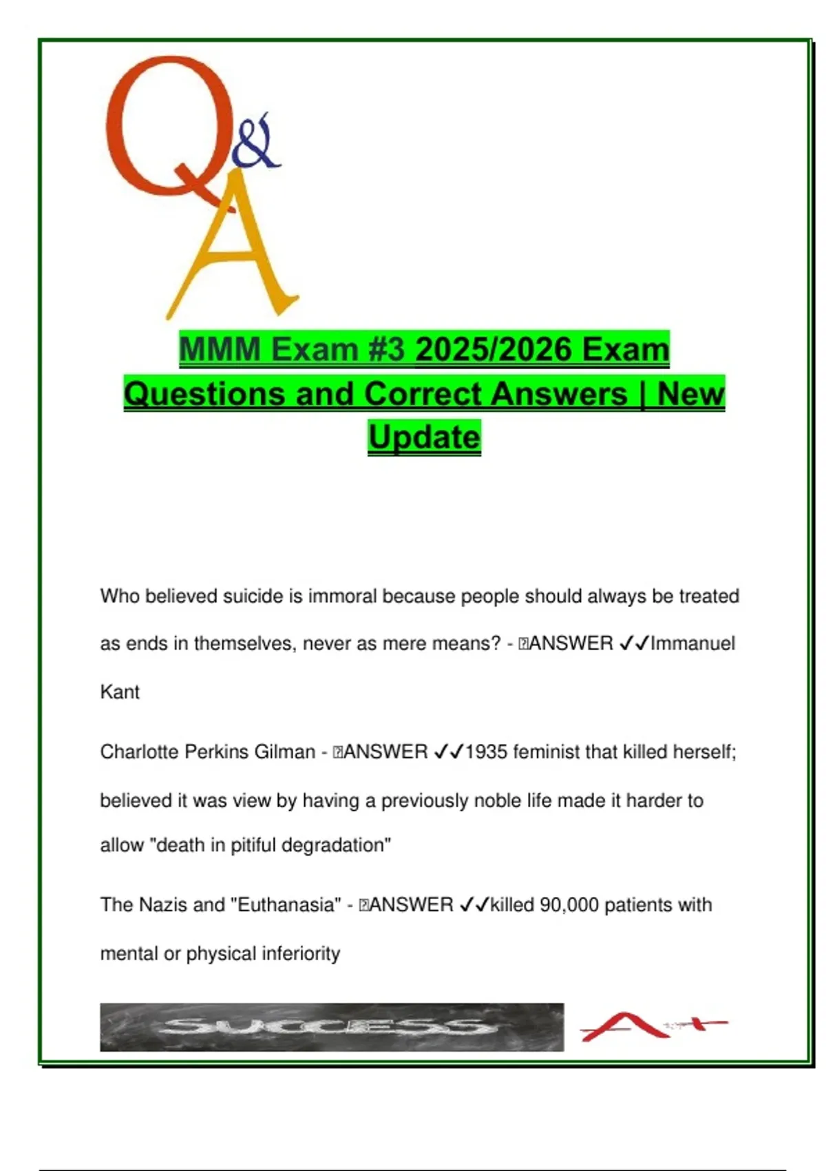 This comprehensive study resource presents 200+ exam questions and accurate answers covering essential topics in bioethics, end-of-life decision-making, medical research ethics, gender identity, and historical medical controversies. Designed for the MMM (Medical Morality and Meaning) Exam 2025/2026, this updated collection is ideal for deep review, class discussions, and professional ethics preparation. The content explores real-world case studies and philosophical perspectives, including: Ethical Theories & Thinkers: Kant, Socrates, Epicurus, Aristotle, Bentham, Mill End-of-Life Cases & Legal Precedents: Karen Quinlan, Nancy Cruzan, Terri Schiavo, Dax Cowart Euthanasia & Physician-Assisted Suicide: Definitions, legal status, distinctions between active and passive euthanasia, Jack Kevorkian case studies Medical Research Ethics: Nuremberg Code, Declaration of Helsinki, IRB, informed consent, Tuskegee Study, Willowbrook Hepatitis Study, Jewish Chronic Disease Hospital Contemporary Issues in Healthcare: Patient autonomy, futility, surrogate decision-making, advance directives, Patient Self-Determination Act Gender, Identity, and Medical Transition: Definitions and distinctions (transgender, transsexual, intersex), historical figures (George Jorgensen, Dr. Harry Benjamin), cultural perspectives, brain structure studies, gender variance in modern society This document is especially suited for: Undergraduate and graduate students in nursing, pre-med, philosophy, medical ethics, psychology, and gender studies Allied health students preparing for exams or case-based ethics coursework US college and university students engaged in clinical ethics or healthcare law Educators and instructors seeking discussion-rich, exam-aligned, real-life case material Each question includes a correct answer based on current academic and clinical ethics standards. The document serves both as a rigorous test prep tool and a springboard for critical thinking in medical decision-making and human rights. Keywords: MMM exam, bioethics questions, euthanasia cases, physician-assisted suicide, Nancy Cruzan, Karen Quinlan, medical ethics, patient autonomy, advance directives, IRB, Nuremberg Code, Helsinki Declaration, informed consent, gender identity, transgender healthcare, medical law, end-of-life care