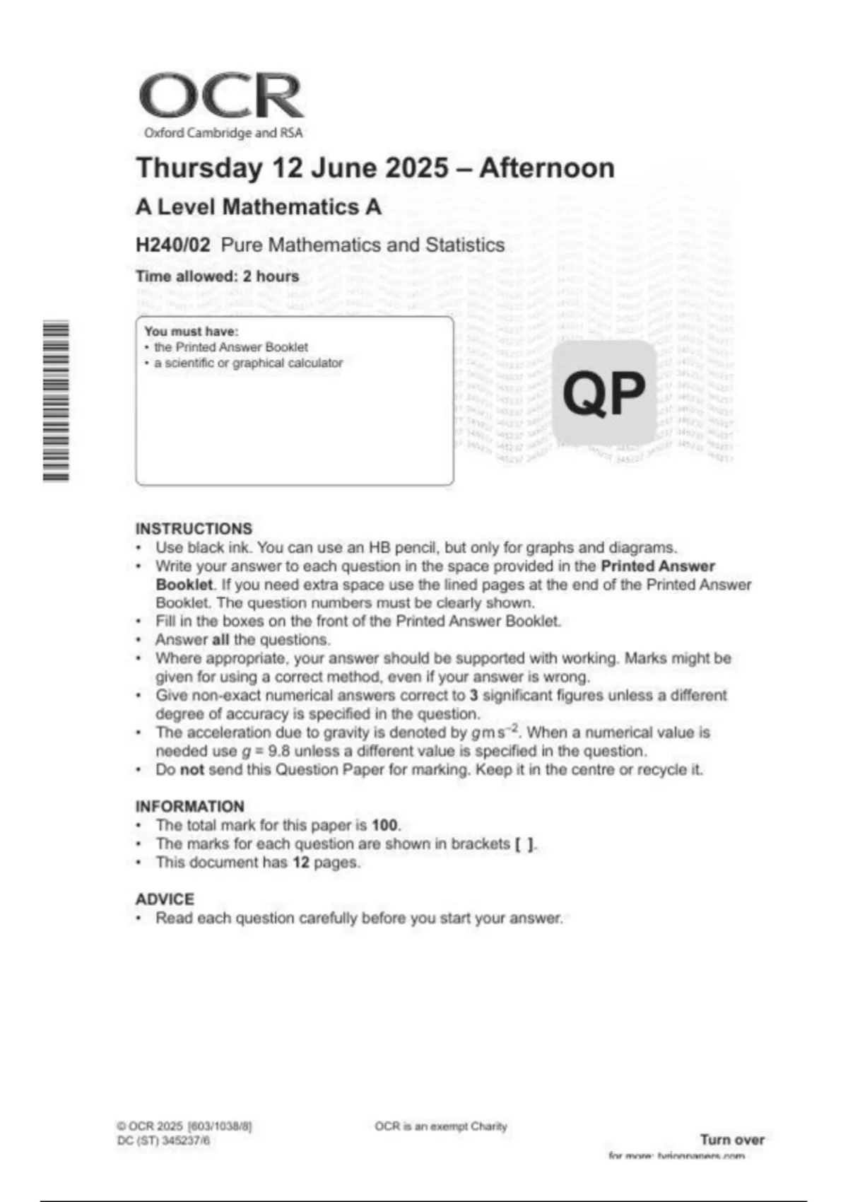 OCR A Level Mathematics A paper 2| H240_02| June 2025 Question paper