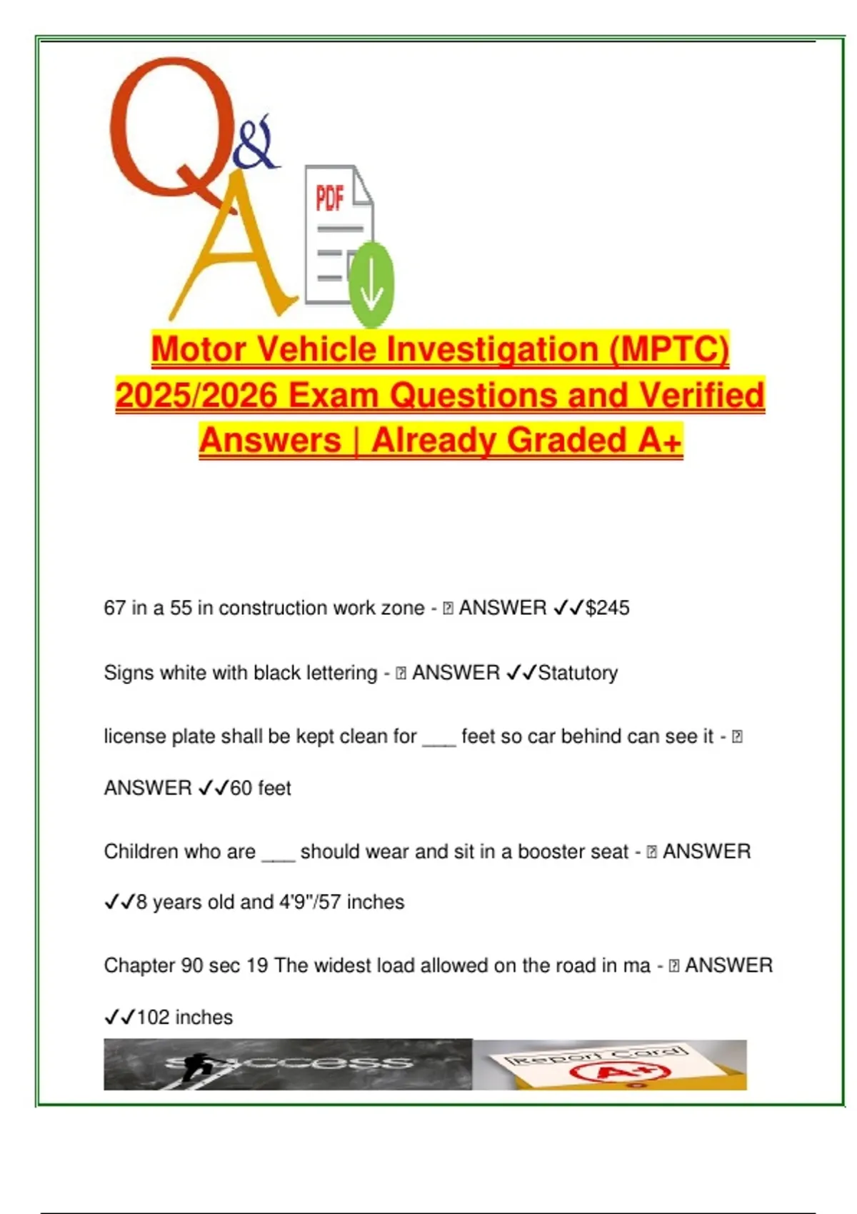 This comprehensive exam guide contains over 170 graded and verified questions from the 2025/2026 MPTC (Municipal Police Training Committee) Motor Vehicle Investigation module. Structured in a Q&A format, it covers all major areas of law enforcement responsibilities related to motor vehicles in Massachusetts. Key topics include the legal definitions of motor vehicles, operators, and public ways; procedures for lawful traffic stops; proper citation delivery methods; and the statutory timelines for inspections, registrations, and crash reporting. Also included are detailed questions on crash scene investigation using the RESPECT model, evidence collection (skids, yaw marks, scuffs, mechanical vs. human evidence), enforcement of Massachusetts General Laws Chapters 85, 89, and 90, and high-risk stop procedures using SCCAN and CYMBOLLS. Students will review inspection sticker classifications (Red R, Black R), emission failures, junior operator restrictions, and the identification of reckless or negligent operation. The guide expands into hazmat awareness, including federal laws (CERCLA, SARA, Clean Water Act), incident command protocols, and environmental control procedures. This resource is essential for MPTC police recruits, criminal justice students, traffic enforcement officers, and university-level learners studying motor vehicle law, crash reconstruction, or public safety. It supports both written exam prep and real-world application. Keywords: MPTC motor vehicle exam, crash investigation, RESPECT model, Massachusetts citation law, Chapter 90 violations, SCCAN method, CYMBOLLS, inspection stickers, public way definition, ULIARS arrest model, gap skid, yaw mark, reckless operation, hazardous material response, CERCLA, traffic stop protocol, vehicle search, emission rejection, uniform citation, field sketching, police academy training