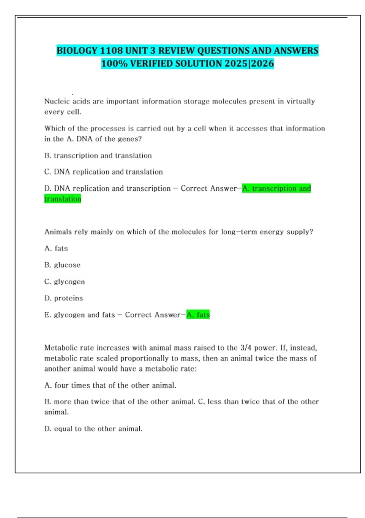 BIOLOGY 1108 UNIT 3 REVIEW QUESTIONS AND ANSWERS 100% VERIFIED SOLUTION 2025|2026