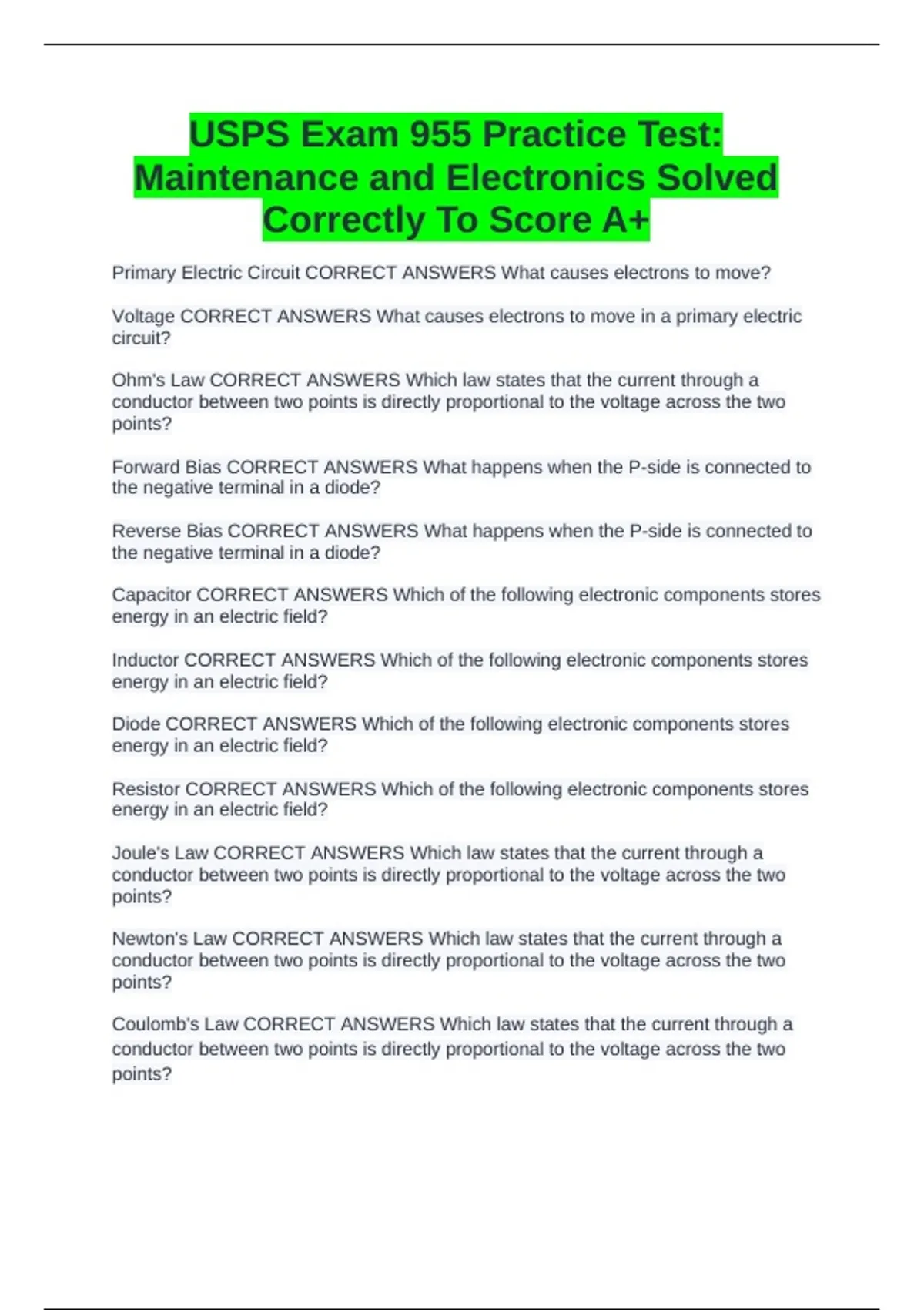 USPS Exam 955 Practice Test: Maintenance and Electronics Solved Correctly To Score A+