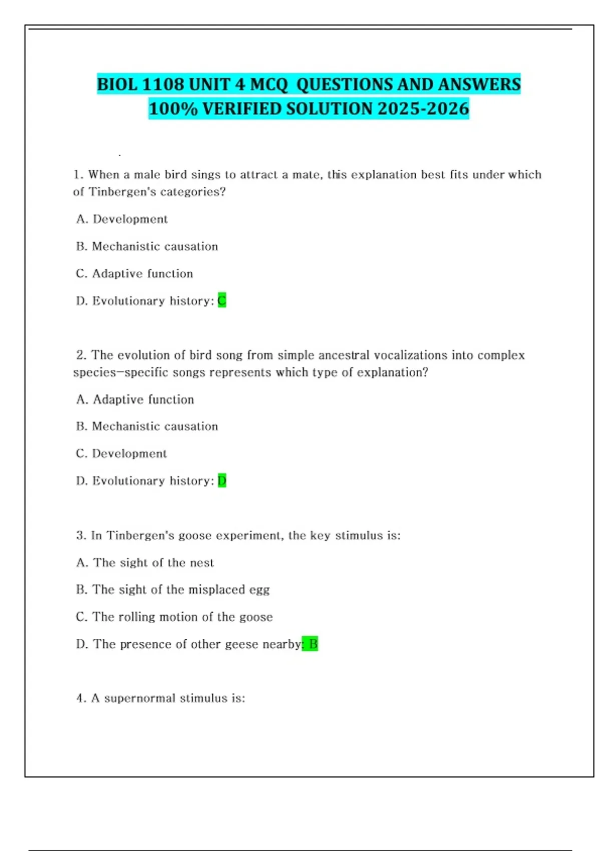 BIOL 1108 UNIT 4 MCQ QUESTIONS AND ANSWERS 100% VERIFIED SOLUTION
