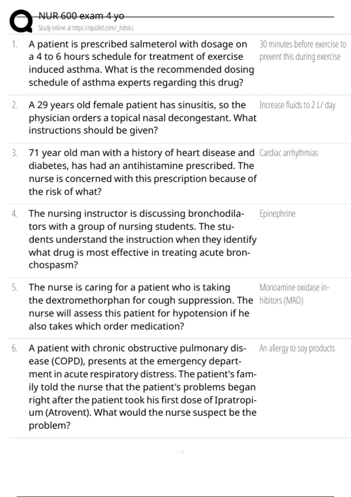 1. A patient is prescribed salmeterol with dosage on 30 minutes before exercise to
