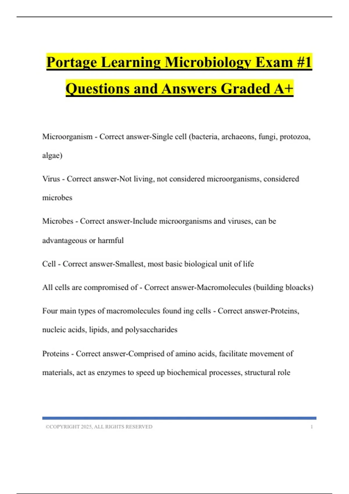 Portage Learning Microbiology Exam #1 Questions and Answers Graded A+