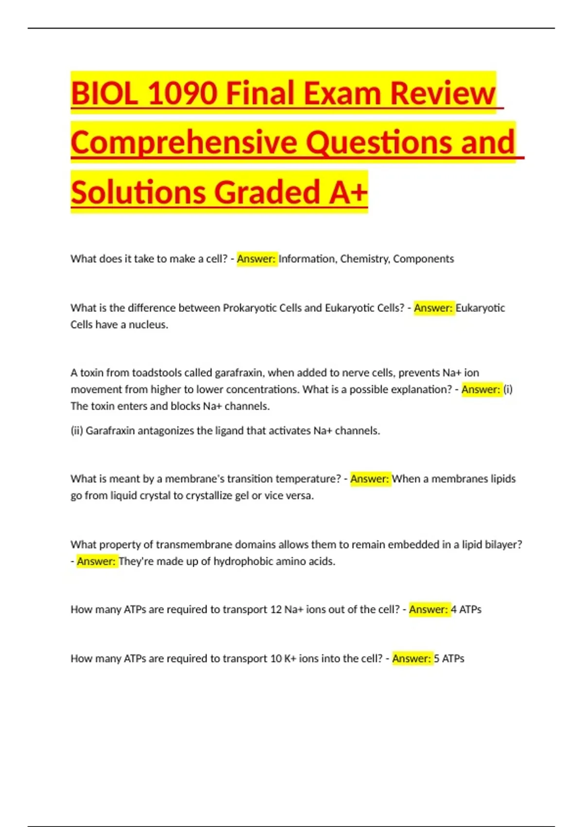 BIOL 1090 Final Exam Review Comprehensive Questions and Solutions Graded A+
