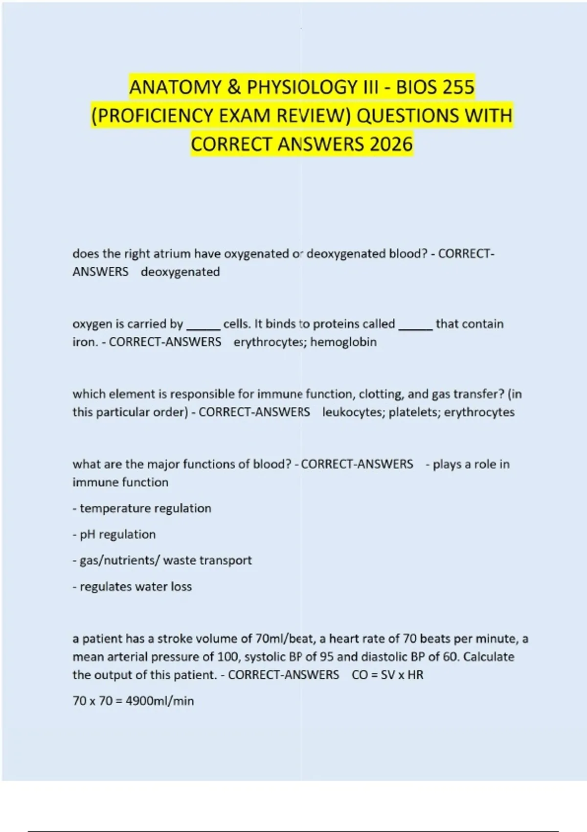 ANATOMY & PHYSIOLOGY III - BIOS 255 (PROFICIENCY EXAM REVIEW) QUESTIONS WITH CORRECT ANSWERS 2026 does the right atrium have oxygenated or deoxygenated blood? - CORRECT-ANSWERS deoxygenated oxygen is carried by _____ cells. It binds to proteins called _____ that contain iron. - CORRECT-ANSWERS erythrocytes; hemoglobin which element is responsible for immune function, clotting, and gas transfer? (in this particular order) - CORRECT-ANSWERS leukocytes; platelets; erythrocytes what are the major functions of blood? - CORRECT-ANSWERS - plays a role in immune function