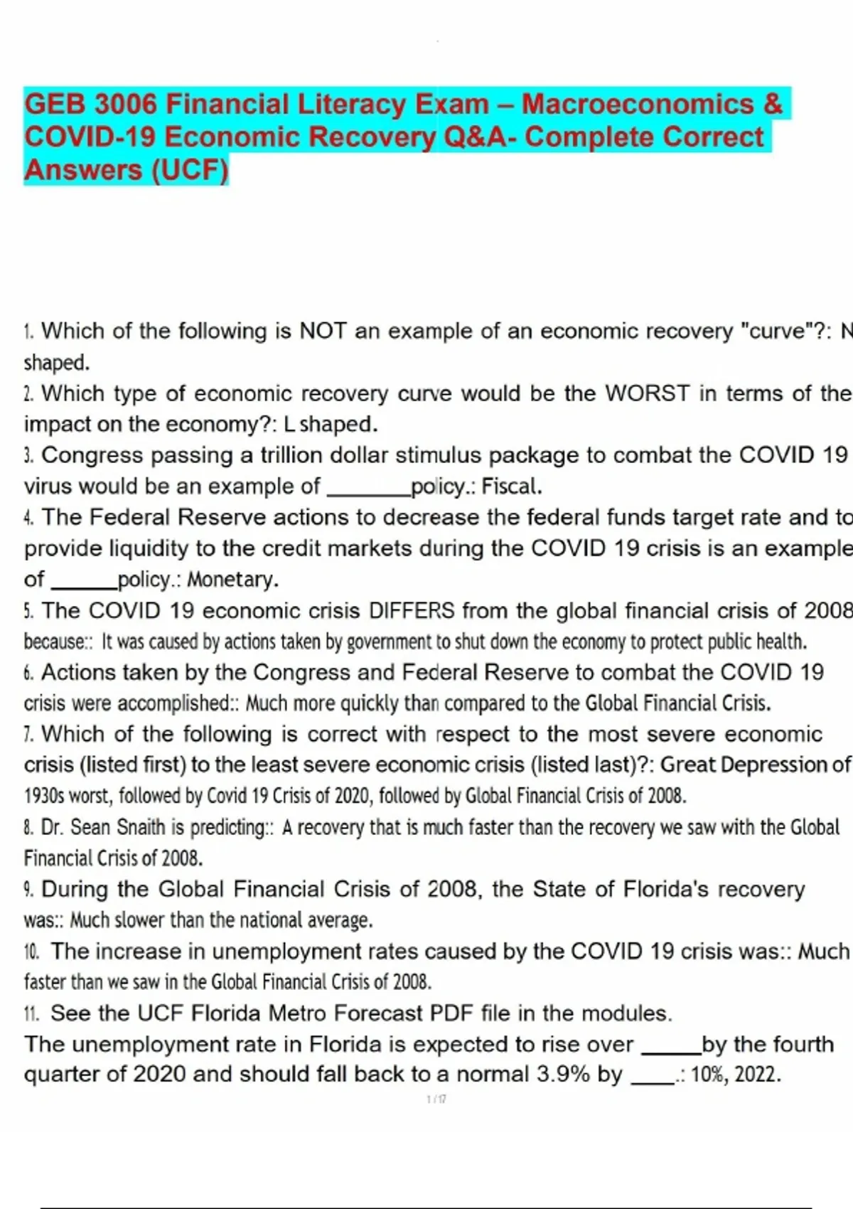 GEB 3006 Financial Literacy Exam – Macroeconomics & COVID-19 Economic Recovery Q&A- Complete Correct Answers (UCF).pdf