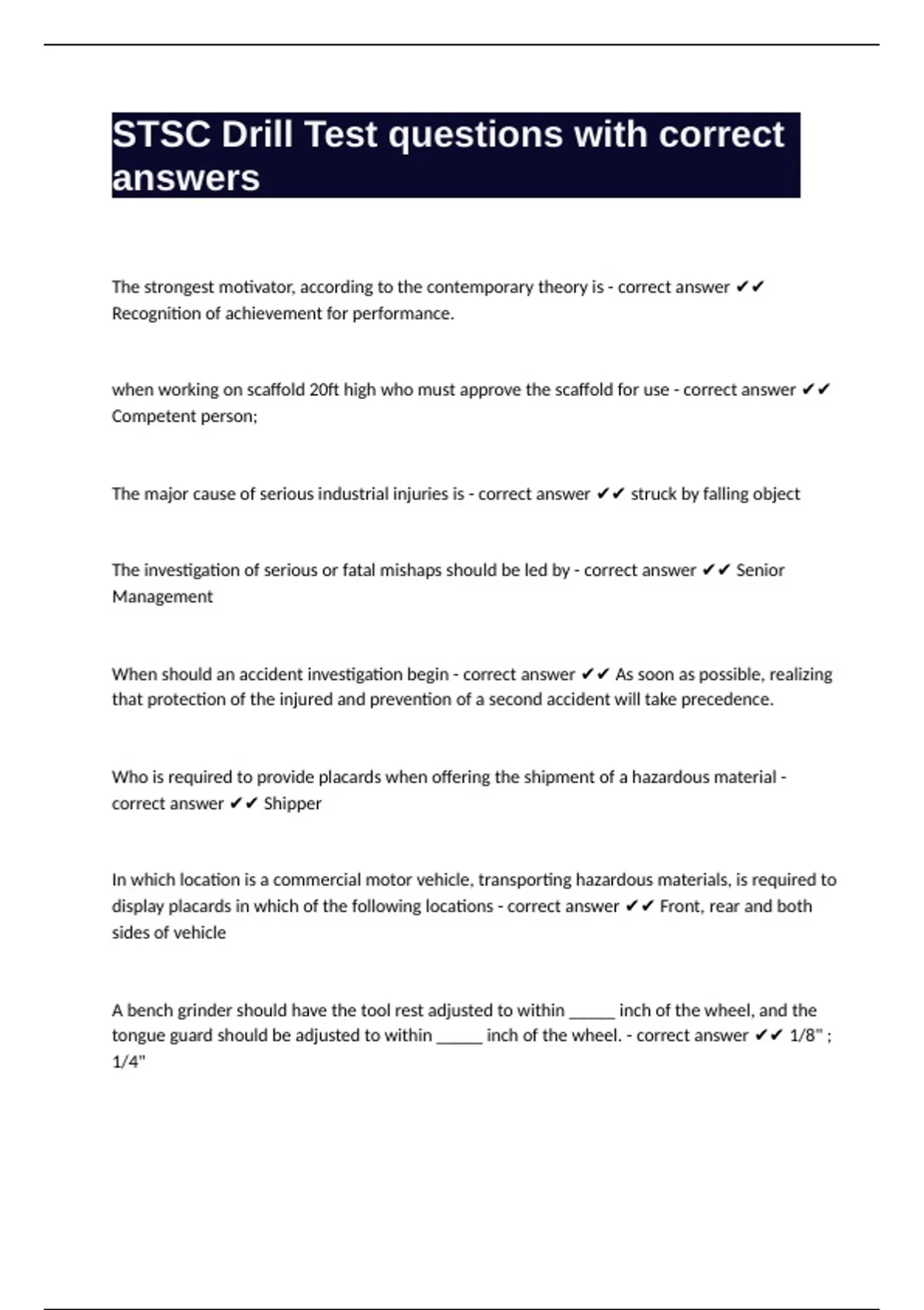 The major cause of serious industrial injuries is - correct answer ✔✔ struck by falling object