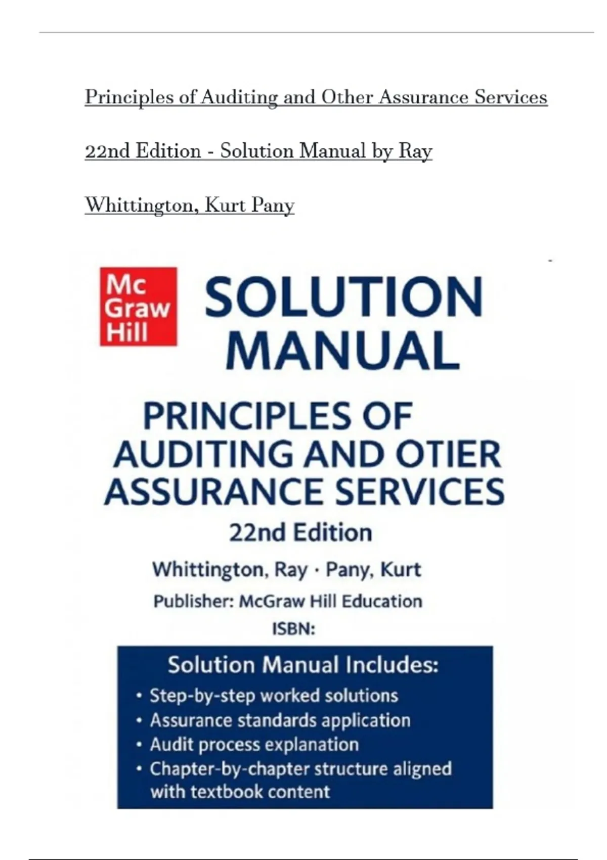 Solution Manual for Principles of Auditing and Other Assurance Services 22nd Edition by Ray Whittington, Kurt Pany 2025|| All Chapters ( 1 - 21 ) A+